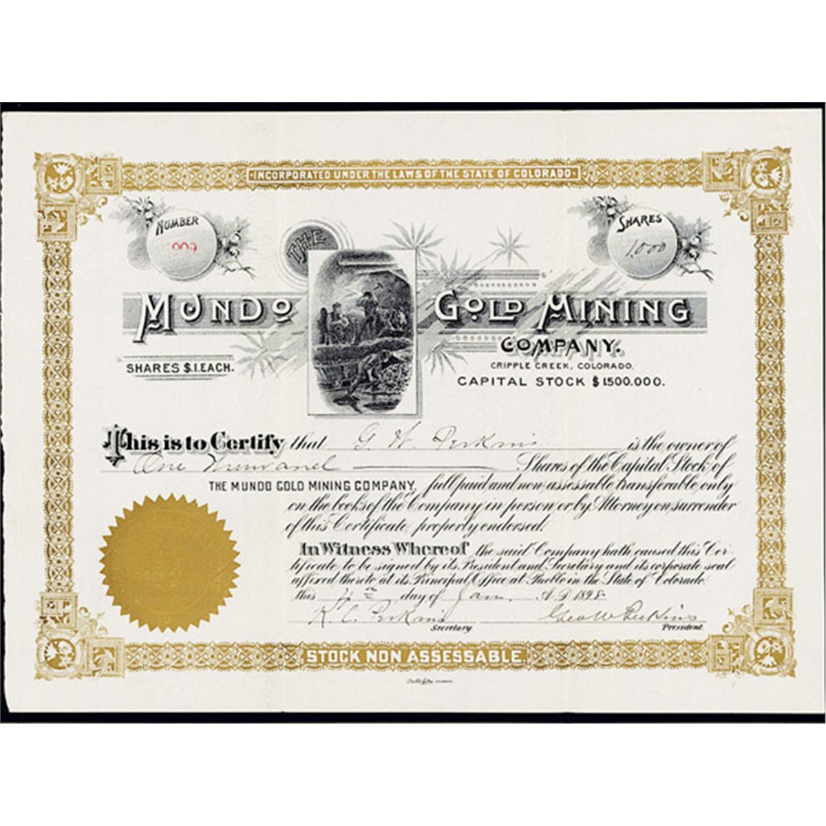 Cripple Creek, Colorado, 1898, 1000 Shs, Issued and uncancelled stock certificate, Gold border and underprint with mining vignette and title in black. XF condition with usual storage filing folds, otherwise in excellent condition and fresh. Rare and attractive Cripple Creek mining stock certificate.