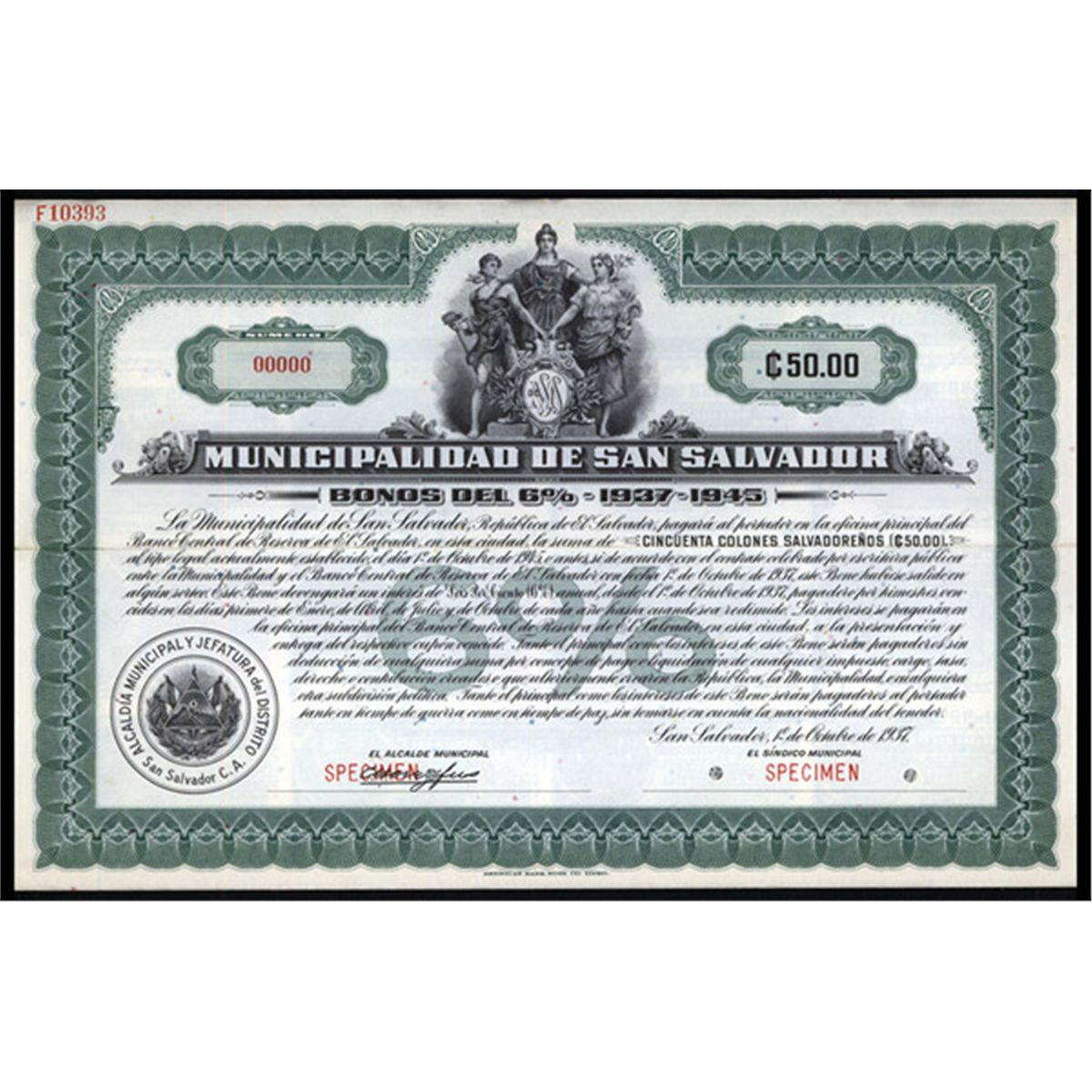 El Salvador, 1937, 50 Colones Salvadorenos, 6% Specimen Bond, Black on green border and underprint, Three standing allegorical woman top center surrounding San Salvado City arms, Coupons attached, VF-XF condition, ABNC.
