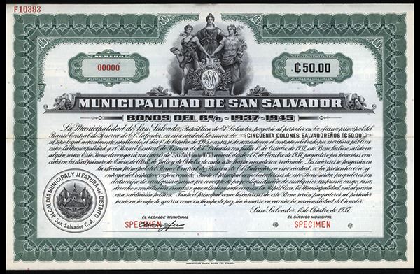 El Salvador, 1937, 50 Colones Salvadorenos, 6% Specimen Bond, Black on green border and underprint, Three standing allegorical woman top center surrounding San Salvado City arms, Coupons attached, VF-XF condition, ABNC.