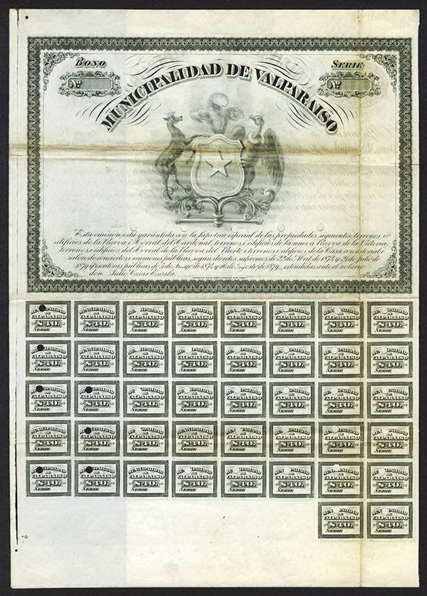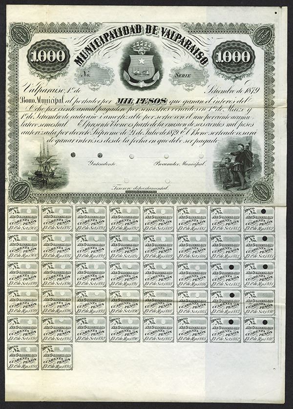 Valparaiso, Chile. Specimen bond. 1879. 1000 Pesos 8% Bond. Black border, title, text and vignettes of Columbus sighting land on right and sailing ship on left with arms of Valparaiso in top middle. Back has arms of Chile. POC. Coupons attached. VF condition. ABNC. Rare bond.