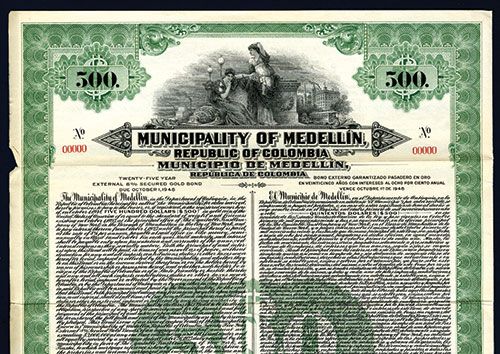 Colombia, 1923, $500, 25 Year External 8% Secured Gold Bond, POC's, VF-XF condition, ABNC.