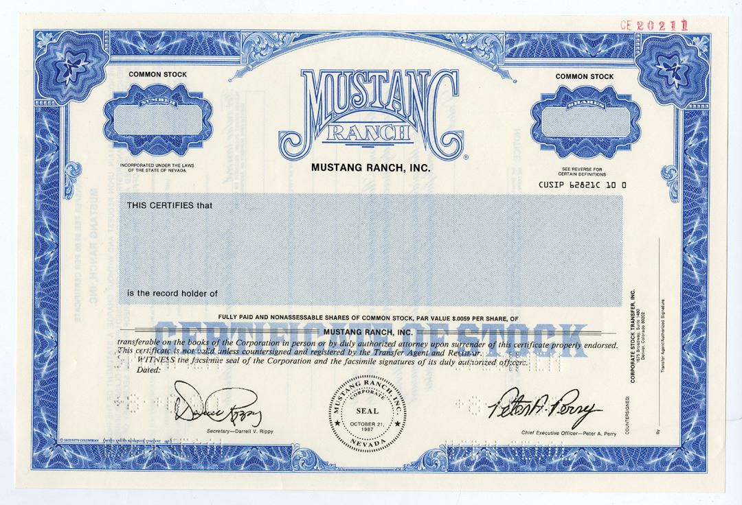 Nevada, 1990. Odd Shares Specimen Stock Certificate, Black text with blue border and underprint, Company name with border at top center. Specimen POCs. VF-XF condition, SC-USBN. The Mustang Ranch is a brothel in Storey County, Nevada, about 20 miles east of Reno. Under owner Joe Conforte, Mustang Ranch Brothel, the precursor to Mustang Ranch, became Nevada's first licensed brothel in 1971. This eventually lead to the legalization of brothels in 10 of 17 counties in the state. Mustang Ranch opened to the public in 1976 and was America's largest brothel with 166 acres, and the most profitable. The Mustang Ranch was forfeited to the federal government in 1999 following Conforte's convictions for tax fraud, racketeering and other crimes. It was auctioned off and reopened in 2005, 5 miles to the east under the same name but different ownership. This was issued under the original owners in 1990. Rare and interesting piece.