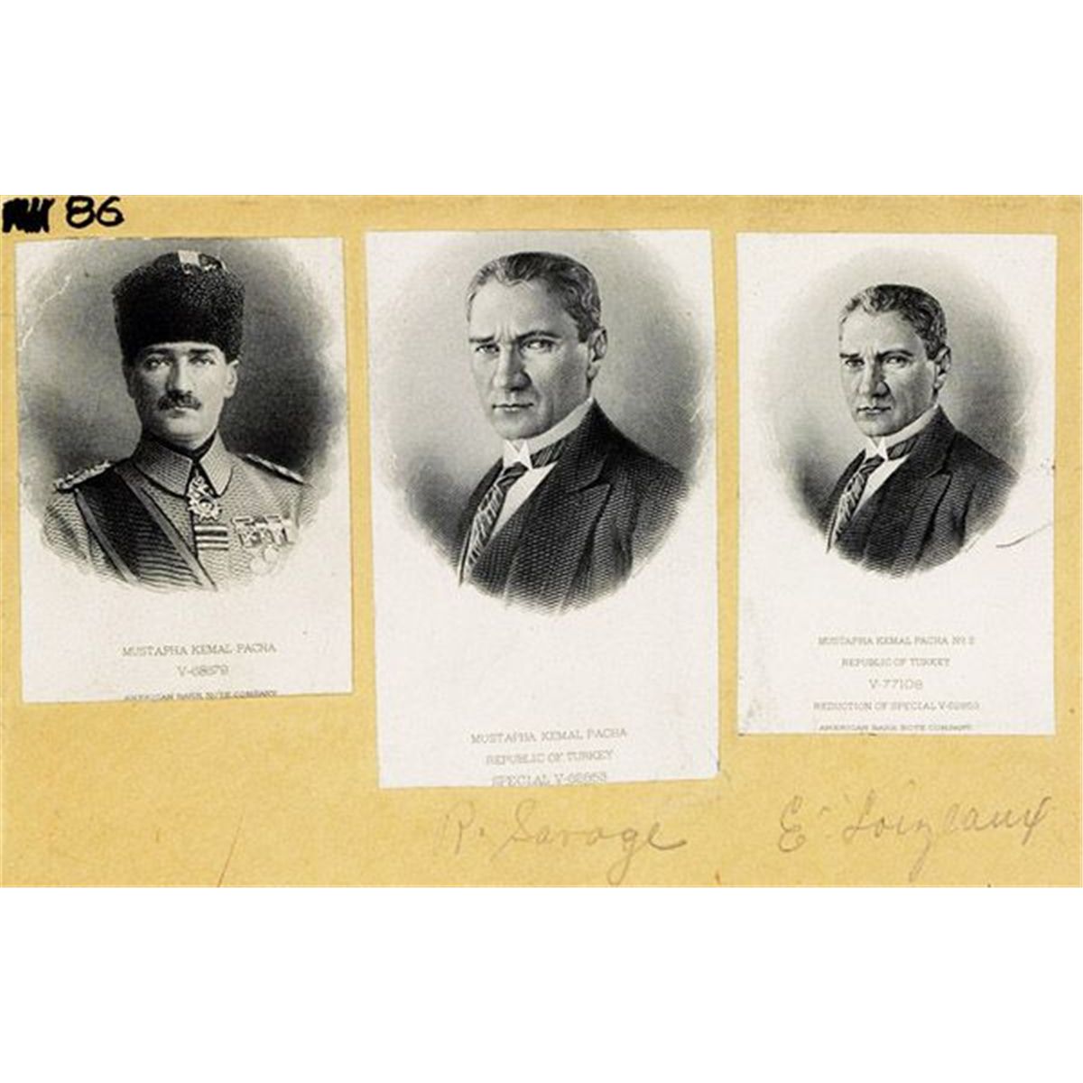 Turkey, ND (ca,1910-20's). Lot of 3 mounted proof portrait vignettes of the famous Turkish leader, Mustapha Kemal Pacha. All 3 are mounted on a 12 by 6 inch manila envelope used to store archival proof vignettes. Includes 2 portraits in civilian dress with striped tie, both the same pose but are different sizes and a third portrait in military uniform with hat and medals, Bottom of vignettes have variations of imprints with his name Mustapha Kemal Pacha and American Bank Note Company imprint. There are also archival notations including plate numbers and names of engraver of the civilian portrait “Savage and Loizeaux”, AU to Uncirculated condition. Evidently these were designs used for some fiscal purpose or were possibly considered for a banknote design that was not used. Rare if not unique format from ABNC archives.