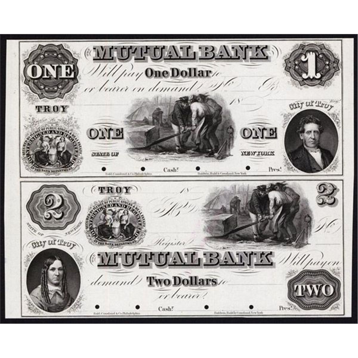 Troy, New York,18xx (ca.1850's), $1-$2, Plate B, A, Similar to NY-2720-G2a, G4a, SENC, SENC, but without red overprint and different printer imprints, BC, BBC instead of BA, Unlisted varieties in Haxby, Black on india paper, both with small POC's, ABN overprint on back in purple-red with light to minimal bleed through, a Choice to Gem Uncirculated pair, BC, BBC, (Bellaire Collection)