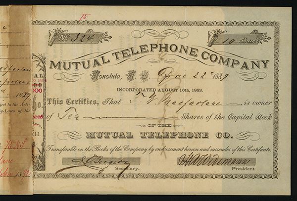 Honolulu, Hawaiian Islands. 1889. Issued stock. 10 Shares. Black border. Ornate certificate no vignette, counterfoil on left. Fine to VF with toning and glue stains where counterfoil glued. Also included is a hand written "Hawaiian Telephone & Telegraph Co." Board of directors meeting notes. Rare Hawaiian telephone stock (actually any stock from this time period in Hawaii is rare).