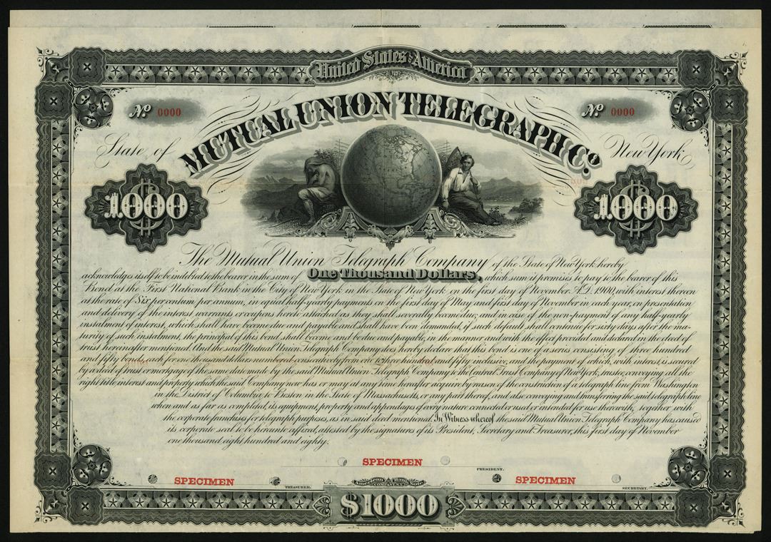 New York, 1880, $1,000. 6% bond. Black border w/ native American and male reaper flanking globe with telegraph wires, Horizontal bond. Specimen w/coupons and POC's. XF, ABNCo. Rare early competitor of Western Union.