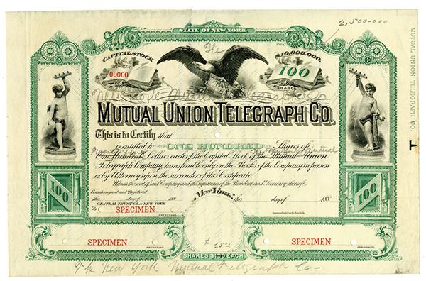 New York, NY. 188x (ca.1880's), 100 Shares, Specimen stock certificate, Black with green border and underprint, Screaming eagle and shield in middle with cherubs holding telegraph lines on left and right, Pencil notations including the corrections and changes, Specimen overprints, POC's, S/N "00000", VF condition, Unique archival production specimen, ABNC.