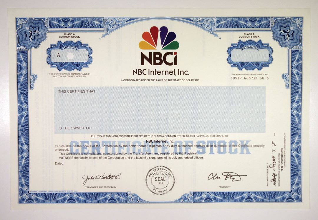 IPO Specimen Class A Stock Certificate, VF SC-USBN. NBC Internet is the new-media unit of NBC. The National Broadcasting Company (NBC) is an American English-language commercial terrestrial radio and television network that is a flagship property of NBCUniversal, a subsidiary of Comcast.