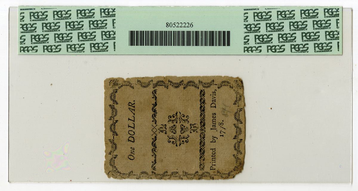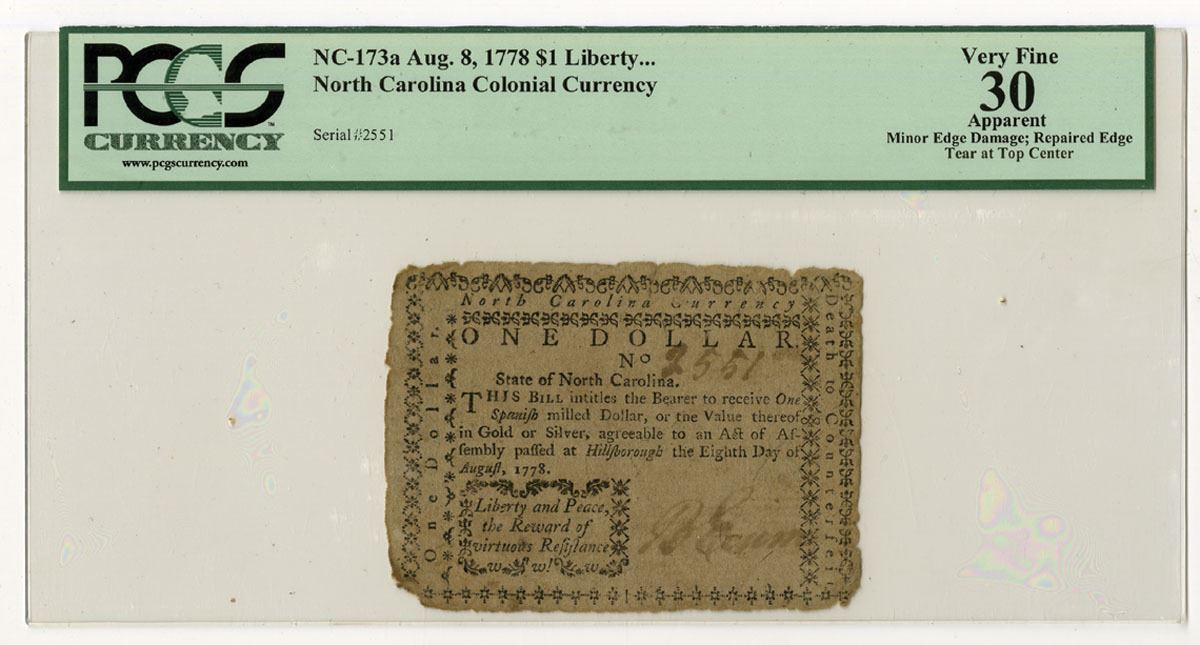 North Carolina, August 8, 1778. 1 Dollar, NC-173a, P-S2249a, Issued Banknote, Black printing with 'Liberty and Peace, the Rewards of Virtuous Resistance' at bottom left, Back has geometric design at center, S/N 2551, PCGS graded Very Fine 30 Apparent with comments "Minor Edge Damage; Repaired Edge Tear at Top Center," James Davis Printer.