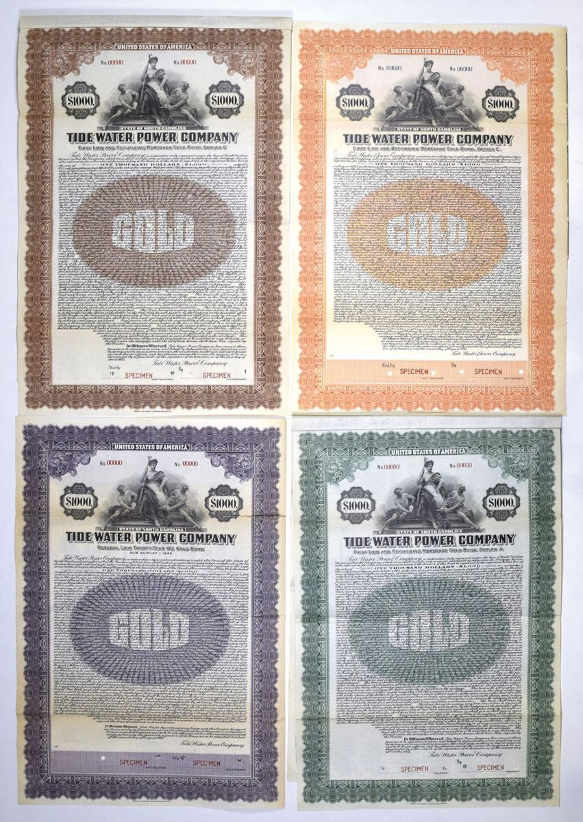North Carolina, 1922-26. Lot of 4 Specimen Bonds all for $1000 in varying colors, All have same vignette of allegorical trio at top center, Specimen overprints, and POCs. Condition varies from VF with splitting with XF. FL-ABNC. (4). Sold "AS IS" no returns accepted.