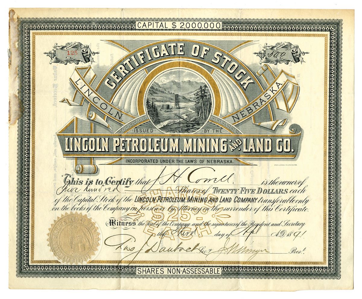 Nebraska..., 1891. 500 Shares I/U Stock Certificate, Black with blue/gray and gold border and title at top with circular vignette of oil mining operation, S/N 125, Fine to VF+ condition with glue damage to left side.