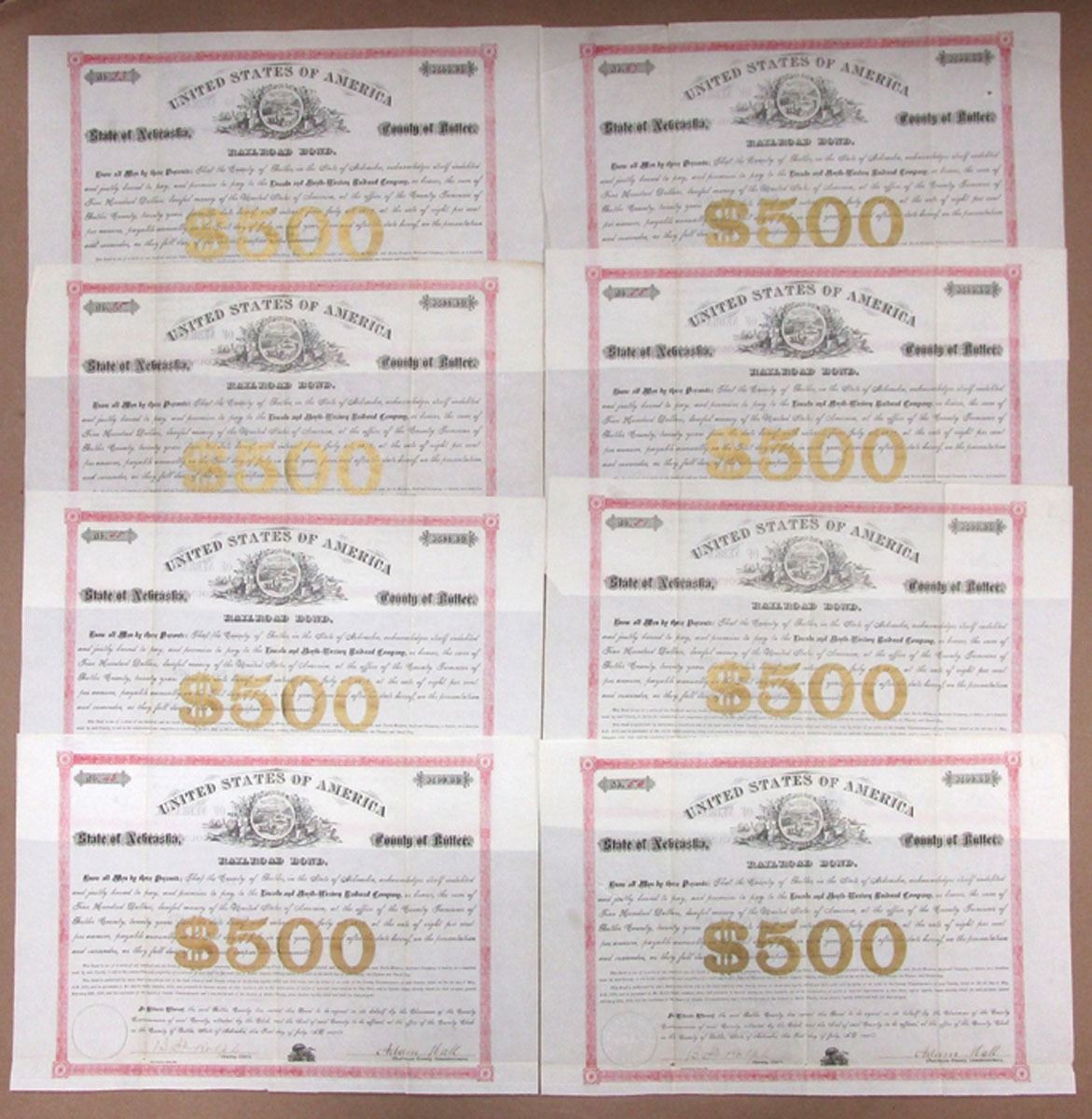Buttler, Nebraska, 1879. $500 I/U 8% Group of 8 Bonds, Black text with red border and gold underprint, Nebraska state seal depicted at top center, S/Ns 33, 35, 45, 46, 50, 51, 55, and 67, Bonds range from VF to XF condition. (8). Sold "AS IS" no returns accepted.