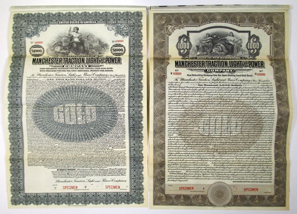 New Hampshire, Lot of 2, 1917 Specimen Railroad Bonds, Includes: $1000 5% First Refunding Mortgage Sinking Fund Gold Coupon Bond, Black with brown border, Two allegorical woman at top with motor, ABNC; and, $1000 5% First Refunding Mortgage Sinking Fund Gold Coupon Bond with Provision for 2% Additional Interest, Black with steel gray border, Allegorical woman at top with light aloft, Franklin Lee- ABNC. Both have Specimen overprints, POCs, and range from VF to XF condition. Both are unlisted as coupon bonds in Cox.