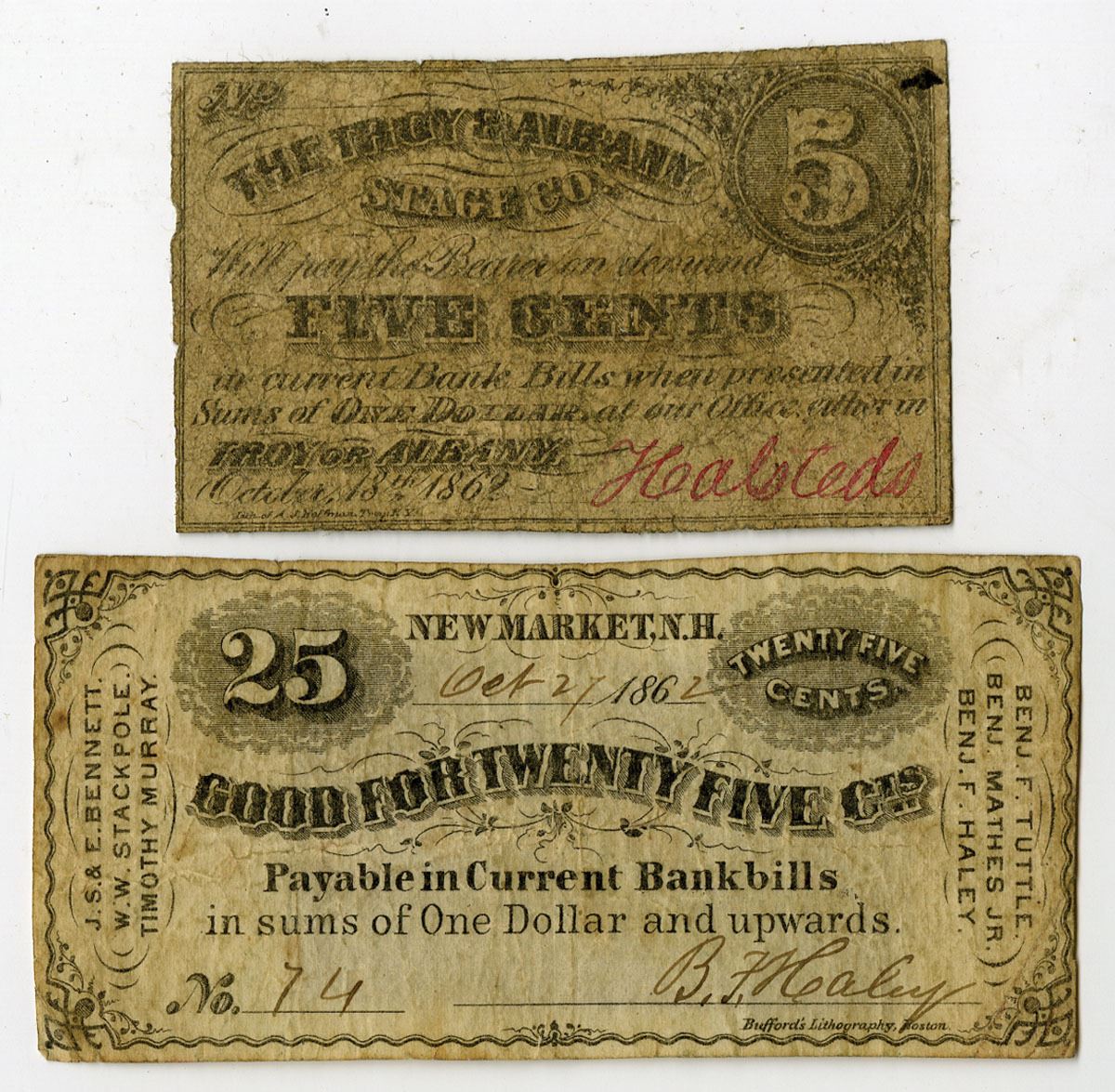 New Hampshire & New York, 1862. Lot of 2 Obsolete Banknotes, Includes: New Market, New Hampshire 25 Cents, S/N 74; and, Troy & Albany Stage Co., 5 Cents. Notes range from VG to Fine+ condition. (2). Sold "AS IS" no returns accepted.