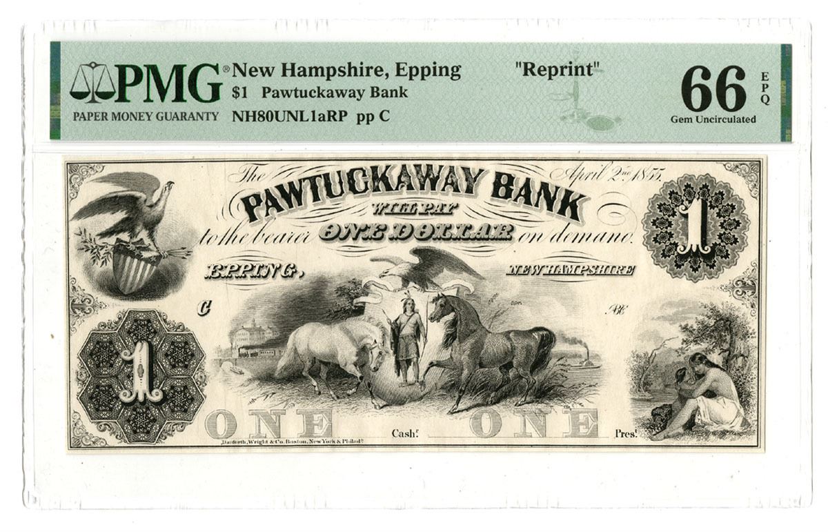 Epping, New Hampshire, 1855, $1, NH-80-UNL-1a-RP pp C, Proprietary-Reprint proof obsolete banknote, Black printing on thin card with Native American warrior at center with horses, Screaming patriotic eagle and shield top left corner, and Native American mother and child lower right corner, Uniface note, PMG graded Gem Uncirculated 66 EPQ, Danforth, Wright & Co. Only lower grade issued examples have been seen at auction and only 4 examples of this note have been graded previously in the PMG census.