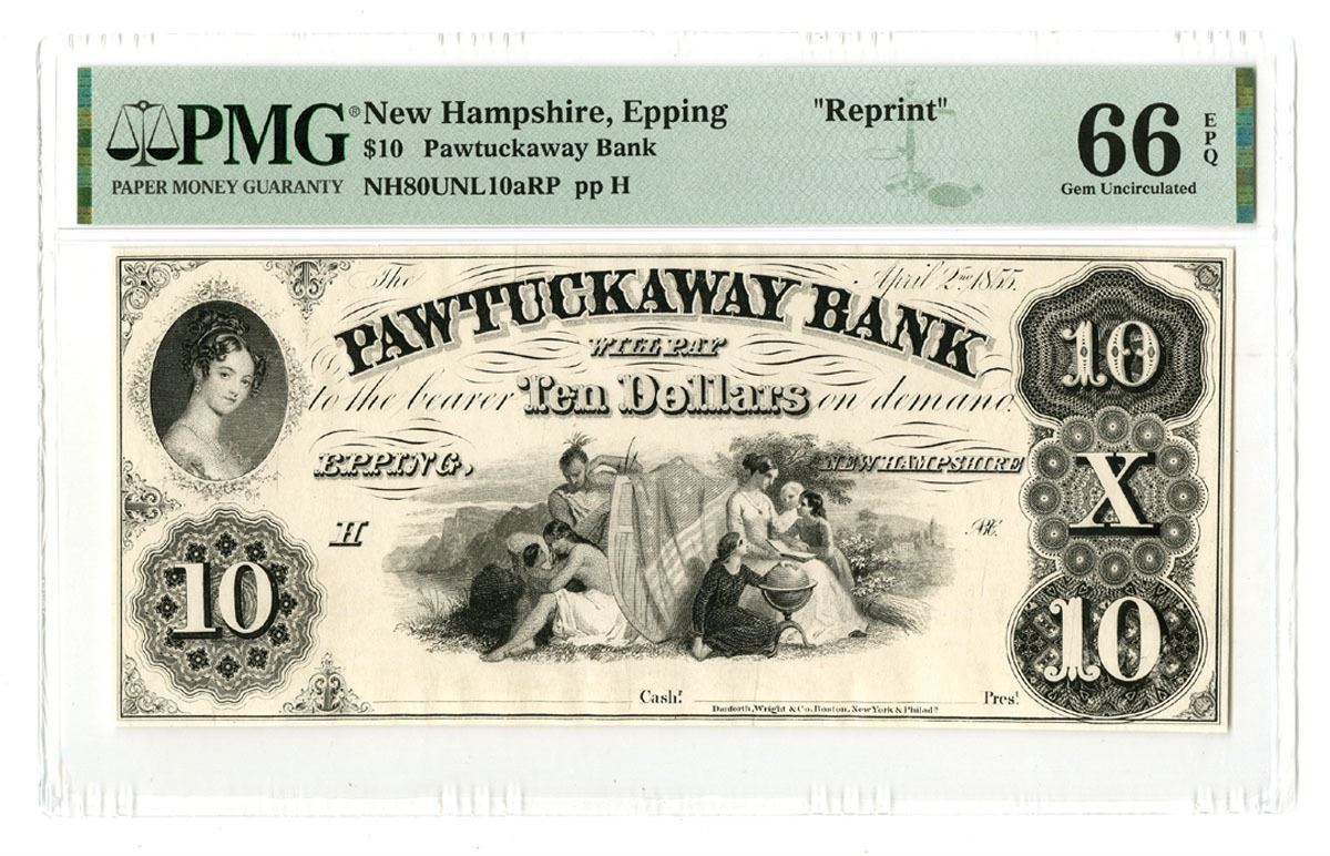 Epping, New Hampshire, 1855. $10, NH80UNL10aRP pp H, Proprietary-Reprint proof obsolete banknote, Black and white printing with Native people and settlers at center and portrait of woman at top left corner, Uniface note, PMG graded Gem Uncirculated 66 EPQ, Danforth, Wright & Co., No issued examples have been seen at auction and only 4 examples of this note have been graded previously in the PMG census.