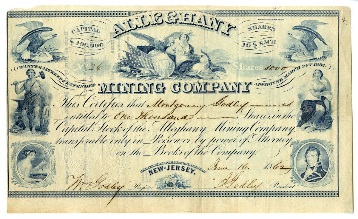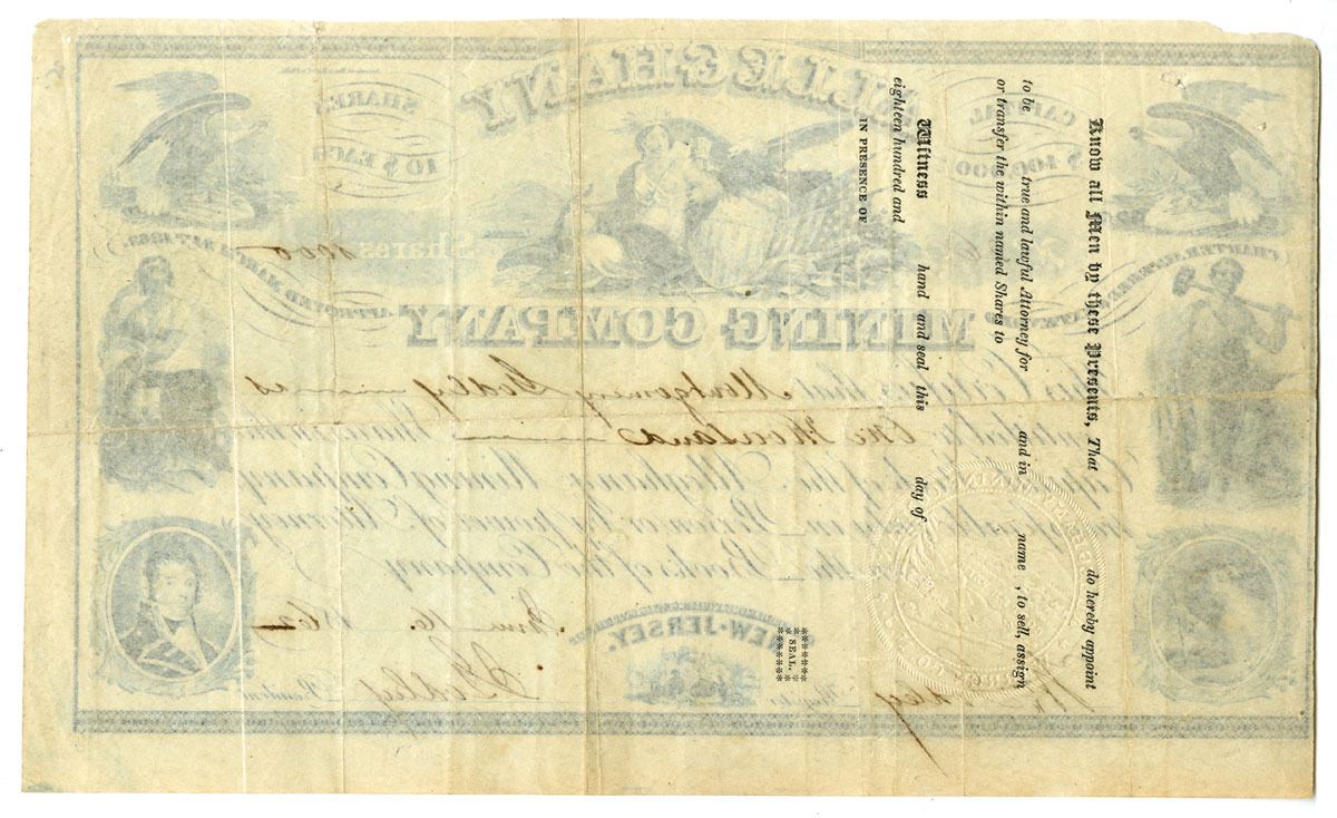 New Jersey. 1,000 Shares Capital Stock I/U Stock Certificate, Blue print on blue border printed on thin paper, Multiple vignettes on certificate, allegorical woman beside shield and bald eagle at top, VF condition. ABNC.