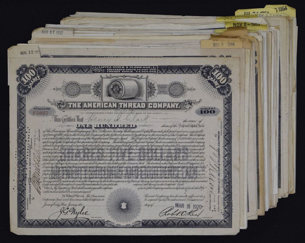 New Jersey, 1907-37. Lot of 121 I/C Preferred Capital Stock Certificates, All have black print with black border, and are in VG with faults to VF condition. The American Thread Company was formed in 1898, from the merger of the English Sewing Company and 13 independent thread and yard companies. At the time of its formation, the American Thread Company was the largest thread company in the world, and remained a successful business throughout the 20th century. The American Thread Building in New York City is listed on the National Register of Historic Places. (121). Sold "AS IS" no returns accepted.