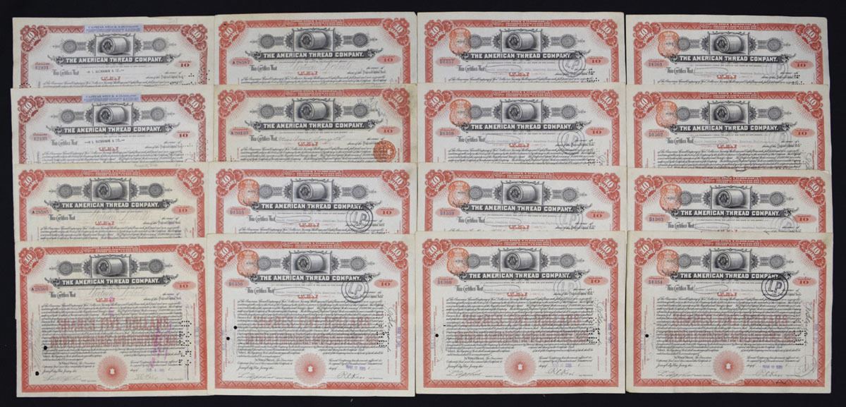 New Jersey, 1911-34. Lot of 16 I/C 10 Shares Preferred Stock Certificates, All have black print with red border, and are in VG with faults to VF condition. The American Thread Company was formed in 1898, from the merger of the English Sewing Company and 13 independent thread and yard companies. At the time of its formation, the American Thread Company was the largest thread company in the world, and remained a successful business throughout the 20th century. The American Thread Building in New York City is listed on the National Register of Historic Places. (16). Sold "AS IS" no returns accepted.