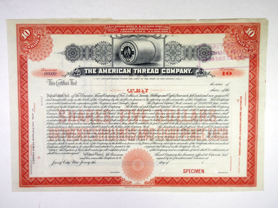 NJ. American Thread Co., ca.1890-1909, 10 Shrs Preferred Stock Specimen Certificate, VF. American Thread Company was incorporated in New Jersey that was considered an important thread company before and after World War I, being a name to reckon with.