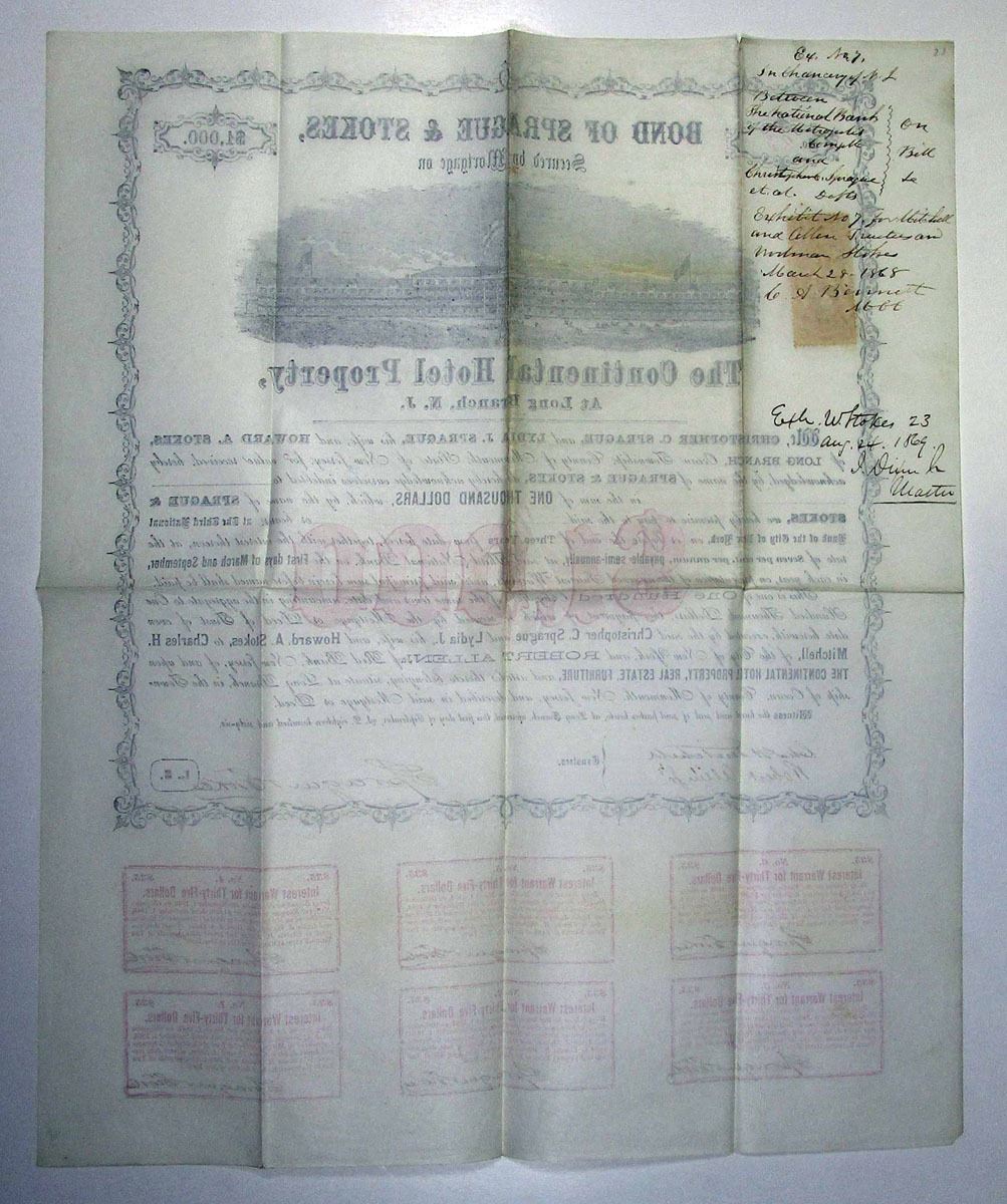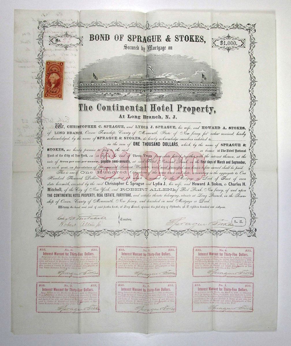 New Jersey. Bond of Sprague & Stokes, Continental Hotel Property., 1866. $1000 I/U Coupon Bond. VF-XF.