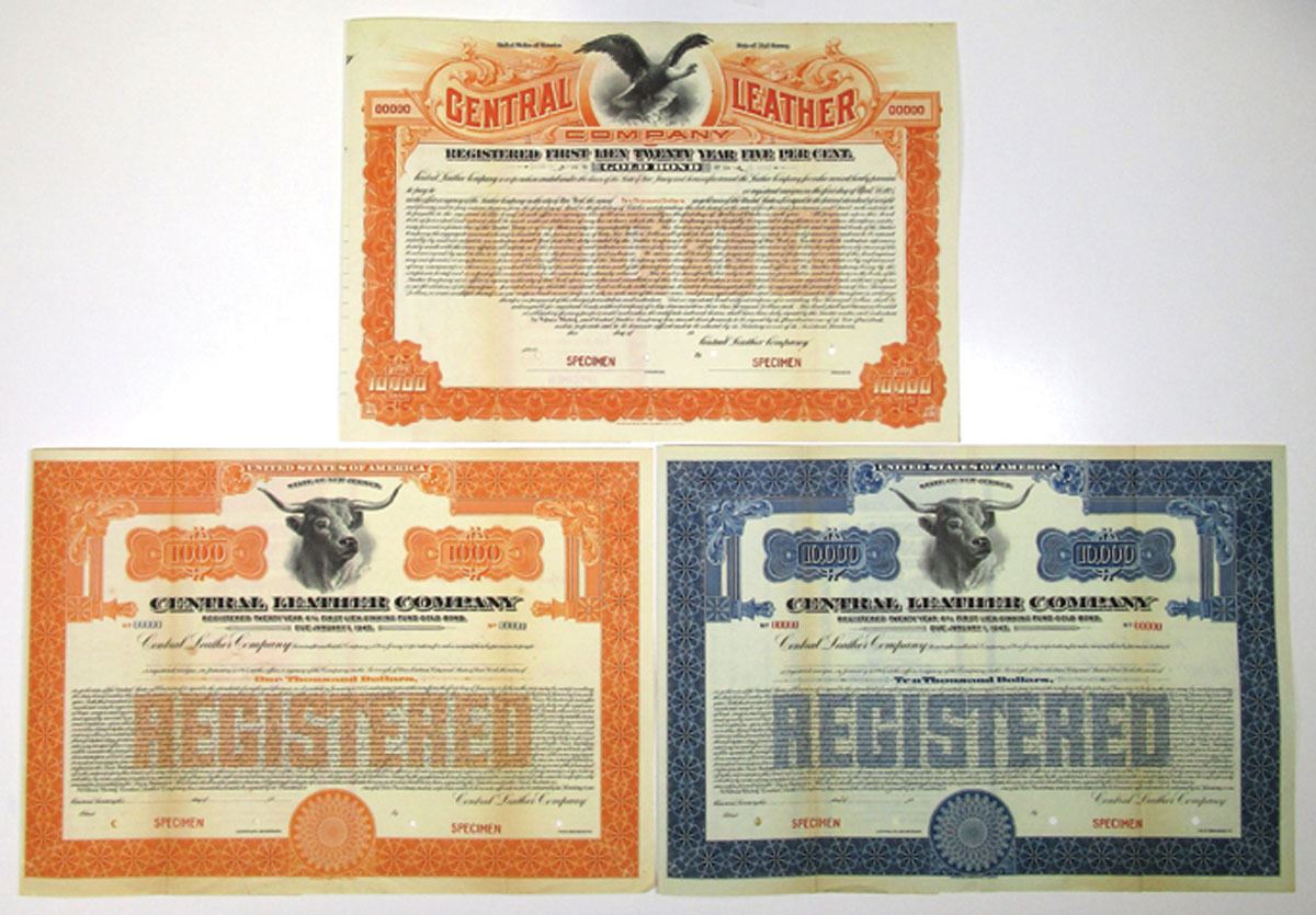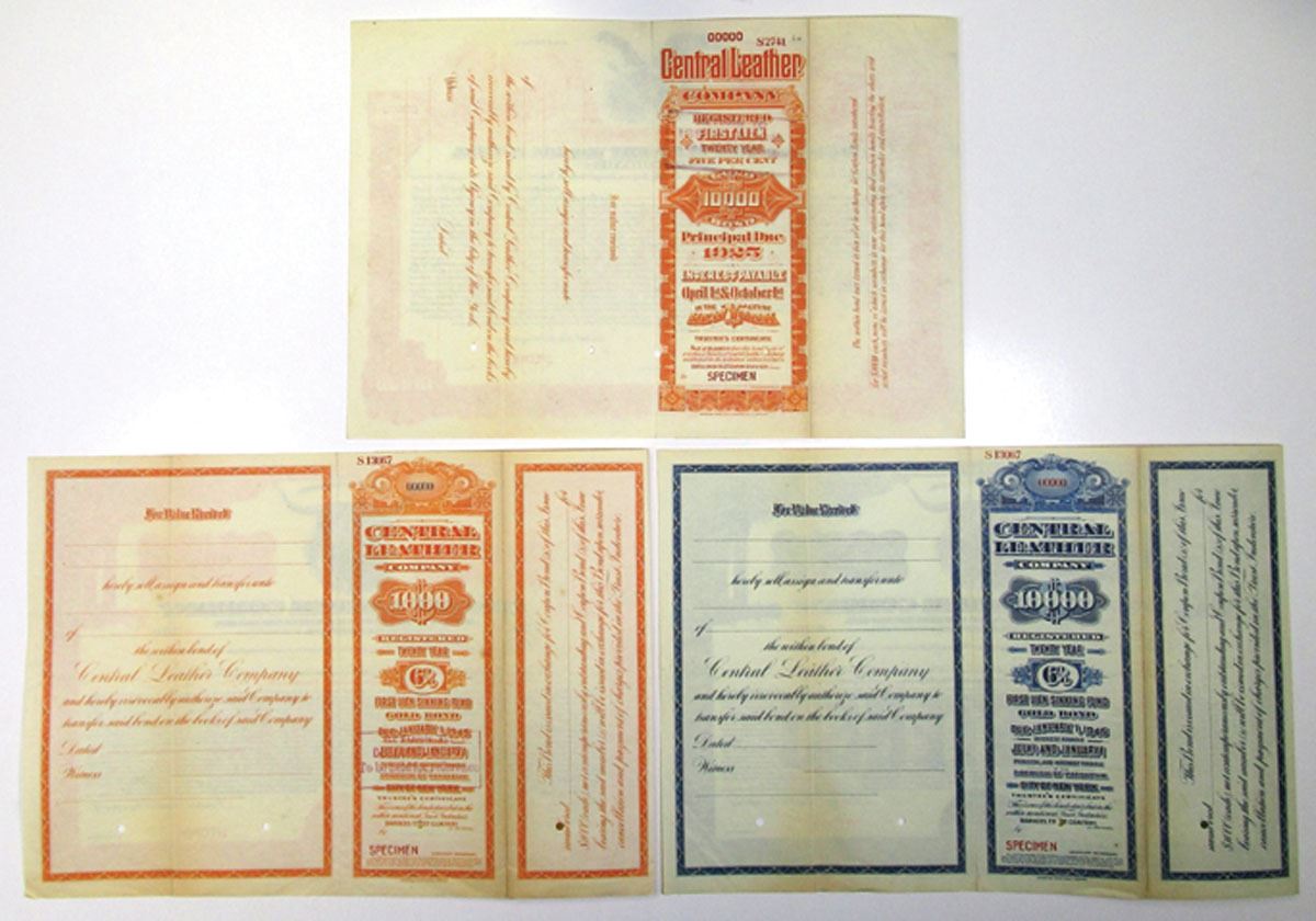 New Jersey, 1905-25. Lot of 3 Specimen Bonds, Including a $1000 Specimen 5% Registered First Lien Gold Bond in orange; $1000 Specimen 6% Registered First Lien Sinking Fund Gold Bond in blue; and $1000 Specimen 6% Registered First Lien Sinking Fund Gold Bond in orange. All have specimen overprints, 00000 serial numbers, and POCs. VF condition, ABNC. (3)