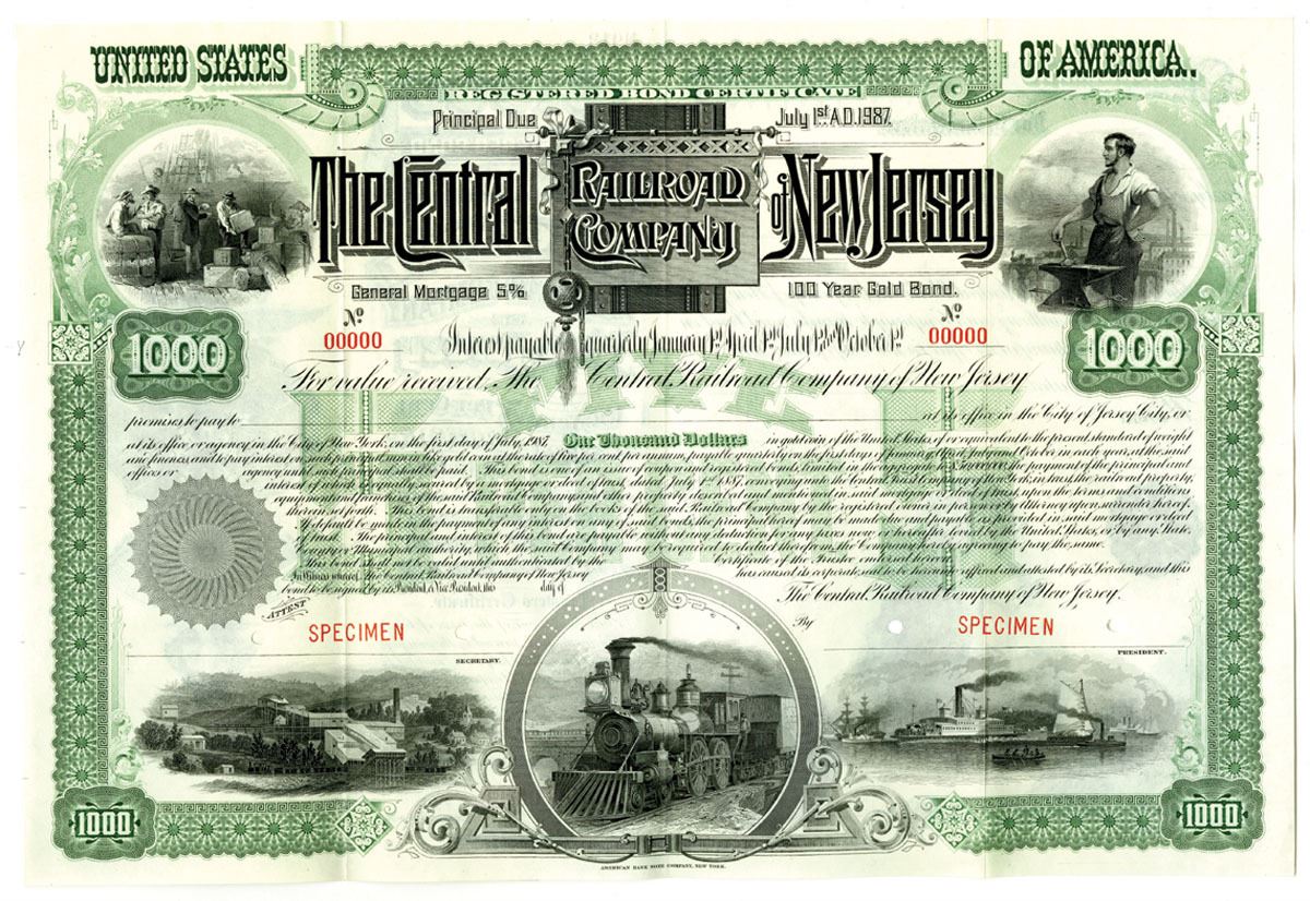 New Jersey, 1887. $1000 Specimen 5% Registered General Mortgage Gold Bond, Black text with green border and underprint, Men loading a ship at top left, Man with an anvil at top right. Red specimen overprints, 00000 serial numbers, and POCs. XF-AU condition, ABNC.