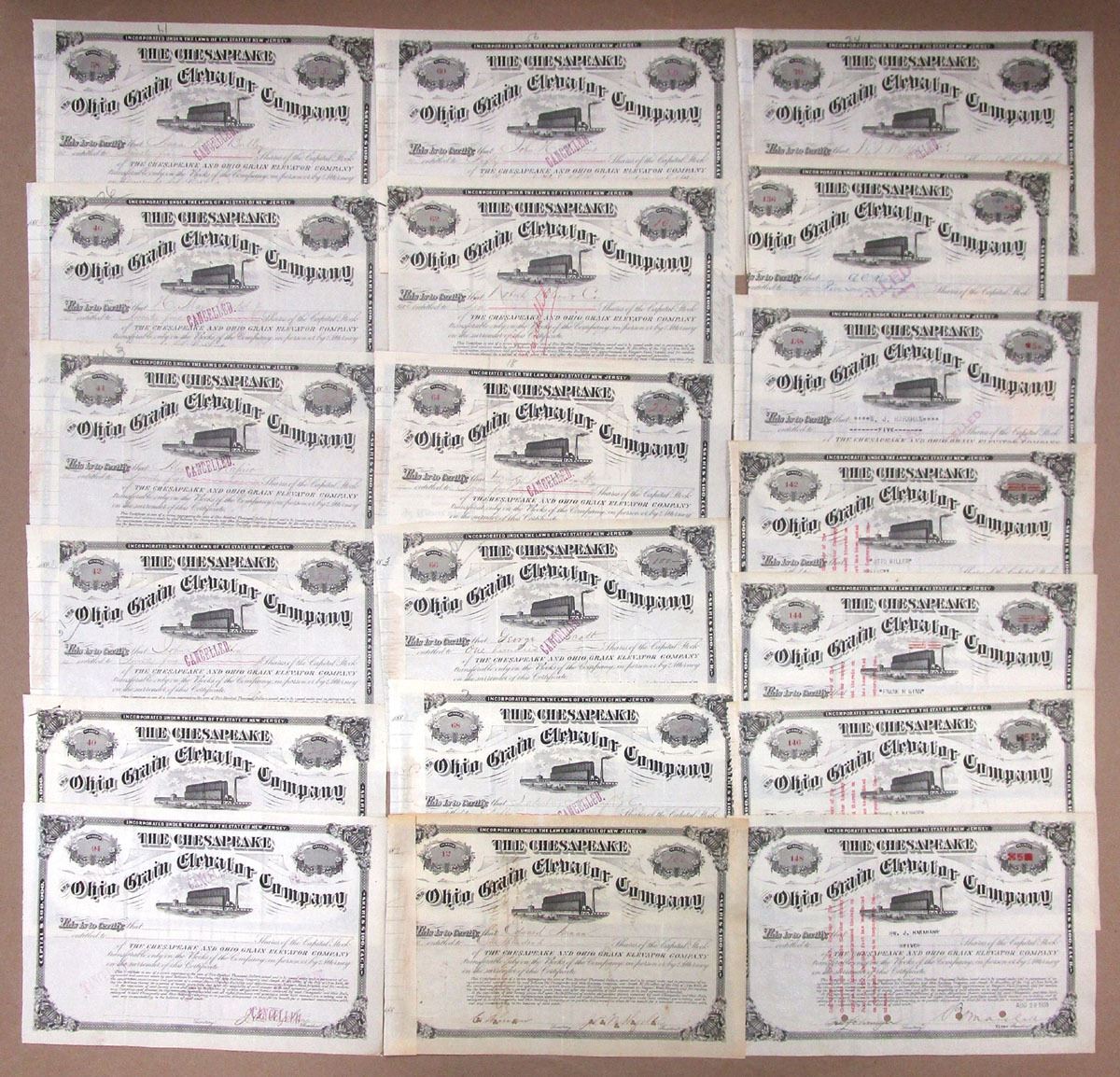 New Jersey, 1880s. Lot of 19 I/C Capital Stock Certificates for Various Share Amounts, All have Black print with black border and small image of factory below company title, Cancelled overprints, Fine to VF condition. (19). Sold "AS IS" no returns accepted.