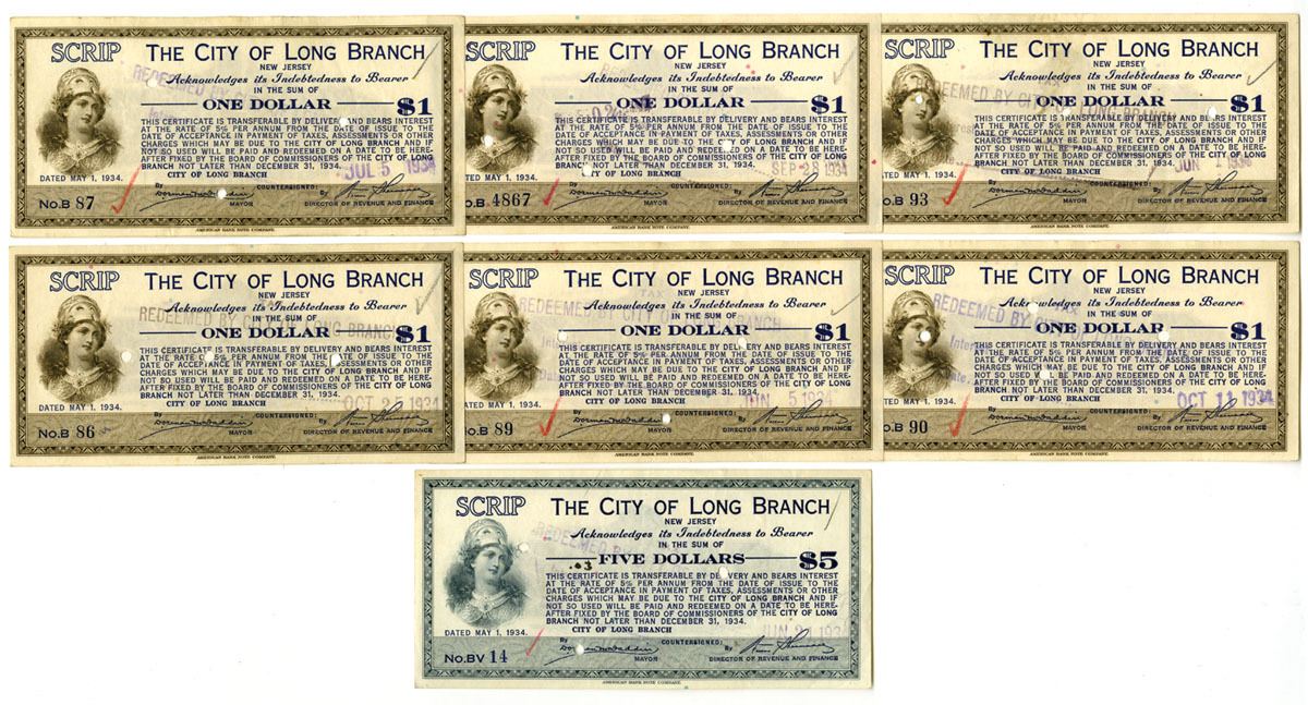 New Jersey, 1934. Lot of 7 I/C Scrip Notes from the City of Long Branch, Includes $1 (6), Blue with brown border and underprint , Includes Low Serial #s B86, B87, B89, B90, B93, and $5, Blue print with blue border, Serial Number BV 14. Notes all have POCs and are in VF to XF condition. ABNC. (7). Sold "AS IS" no returns accepted.