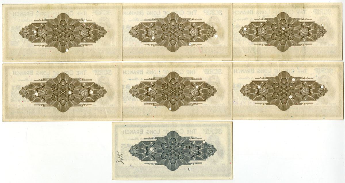 New Jersey, 1934. Lot of 7 I/C Scrip Notes from the City of Long Branch, Includes $1 (6), Blue with brown border and underprint , Includes Low Serial #s B86, B87, B89, B90, B93, and $5, Blue print with blue border, Serial Number BV 14. Notes all have POCs and are in VF to XF condition. ABNC. (7). Sold "AS IS" no returns accepted.