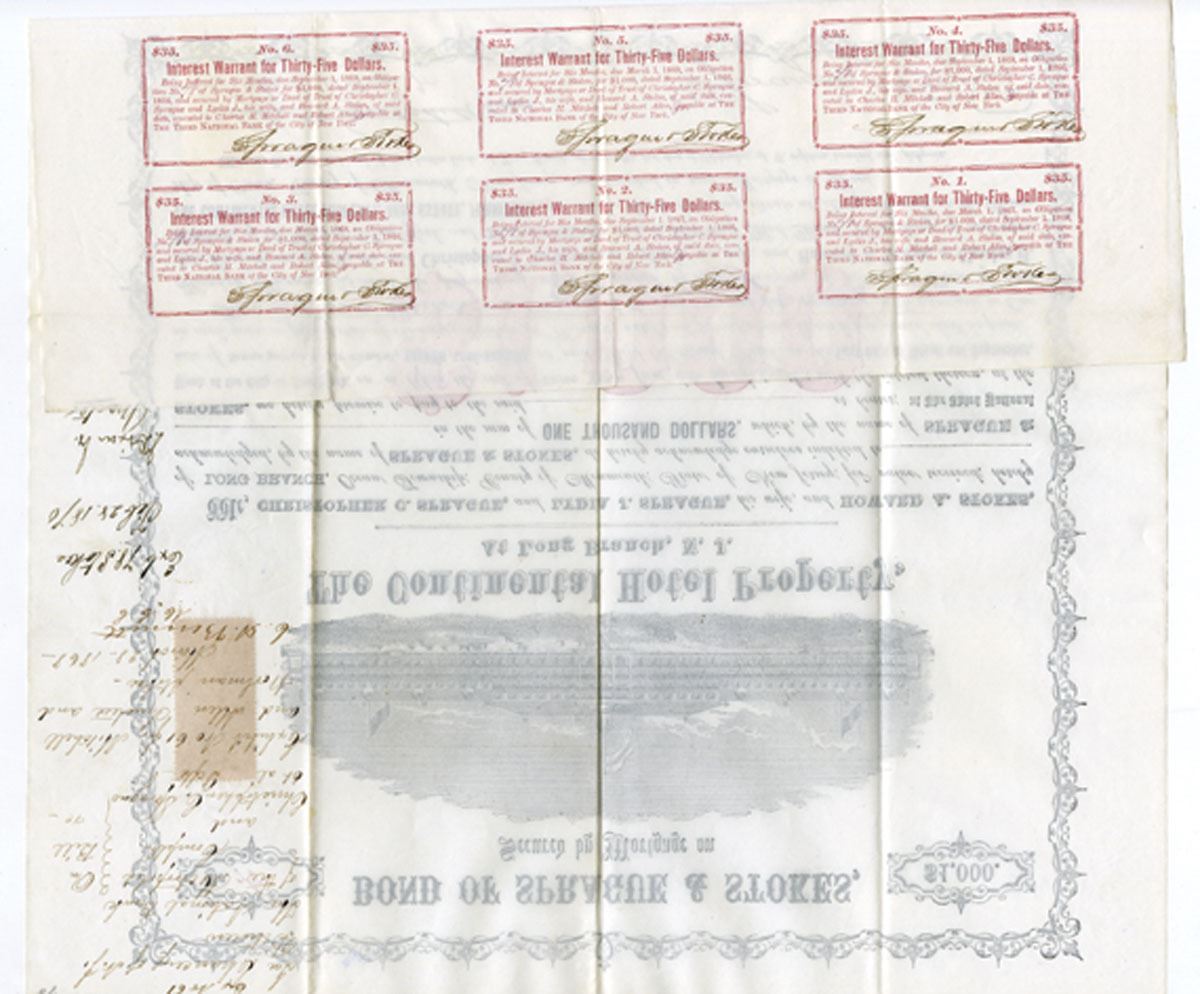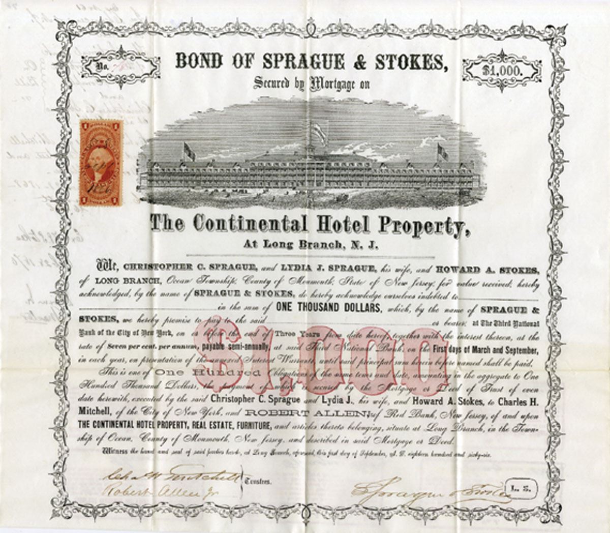 New Jersey, 1866. $1000 U/U 7% Bond, Black print with simple black border and red underprint, 1 Dollar revenue stamp at left, S/N 78, XF to AU condition.