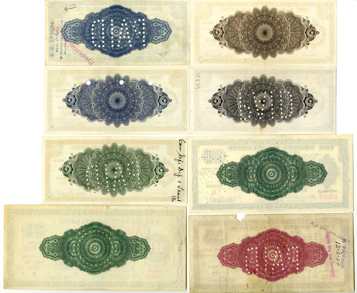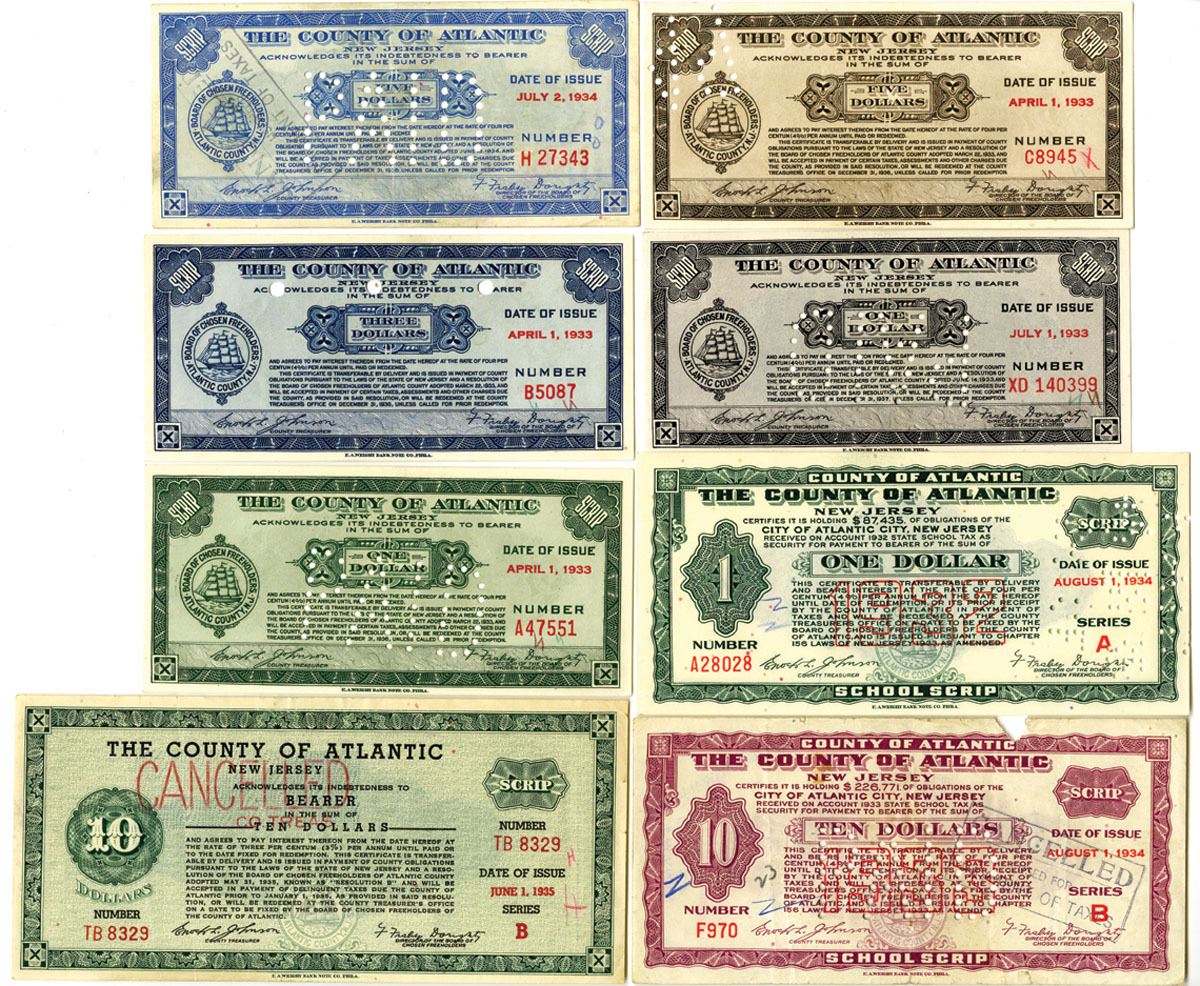 Atlantic County, New Jersey, 1933-35. Lot of 8 Pieces, all are Depression Scrip I/C Notes for Atlantic County, New Jersey, Includes: $1 in green, 1933; $1 in gray, 1933; $1 School Scrip in green, 1934; $5 in brown, 1933; $5 in blue, 1934; $3 in blue, 1933; $10 School Scrip in pink, 1934; $10 in green. All have cancelled stamps or POCs, are in VF to AU condition. E. A. Wright BNC. (8) Sold "AS IS" no returns accepted.