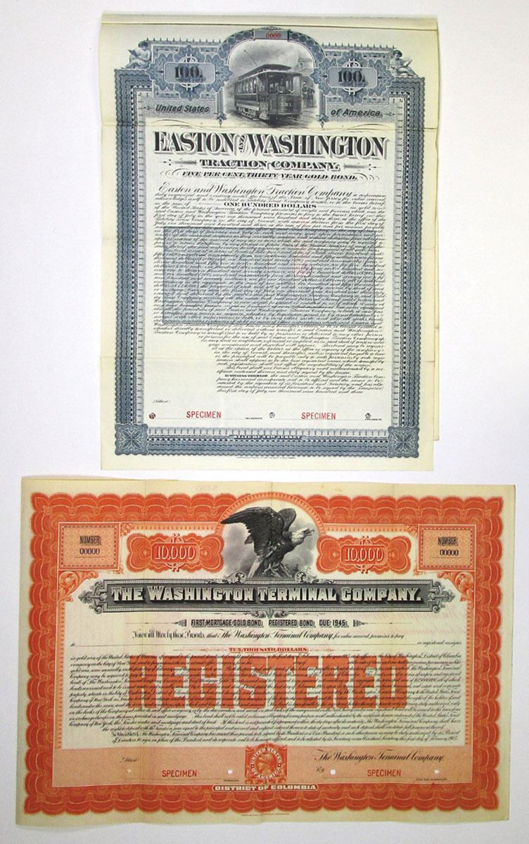 New Jersey and Washington, D.C., 1903-05. Lot of 2 pieces, includes: Easton and Washington Traction Co., $100 Specimen 5% Gold Coupon Bond, featuring a conductor driving a trolley, Unlisted in Cox, Very Rare; and Washington Terminal Co., $10,000 Specimen 3.5% First Mortgage Registered Gold Bond, featuring an eagle at top center, Rare in Cox. Both have specimen overprints, 0000 serial numbers, and POCs. VF-XF condition, ABNC. (2)