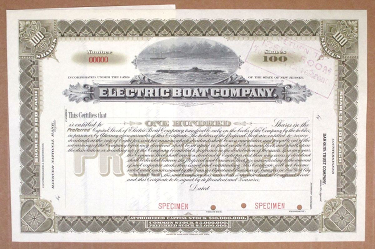New Jersey, ND (1920-30s). 100 Shares Preferred Stock Specimen Certificate, Black print with brown border and underprint with submarine vignette at top, Specimen overprints and POCs, XF to AU condition, ABNC. The company was founded in 1899 by Isaac Rice as the Electric Boat Company to build John Philip Holland's submersible ship designs, which were developed at Lewis Nixon's Crescent Shipyard in Elizabeth, New Jersey. Holland VI was the first submarine that this shipyard built. In 1952, Electric Boat was reorganized as General Dynamics Corporation under John Jay Hopkins.