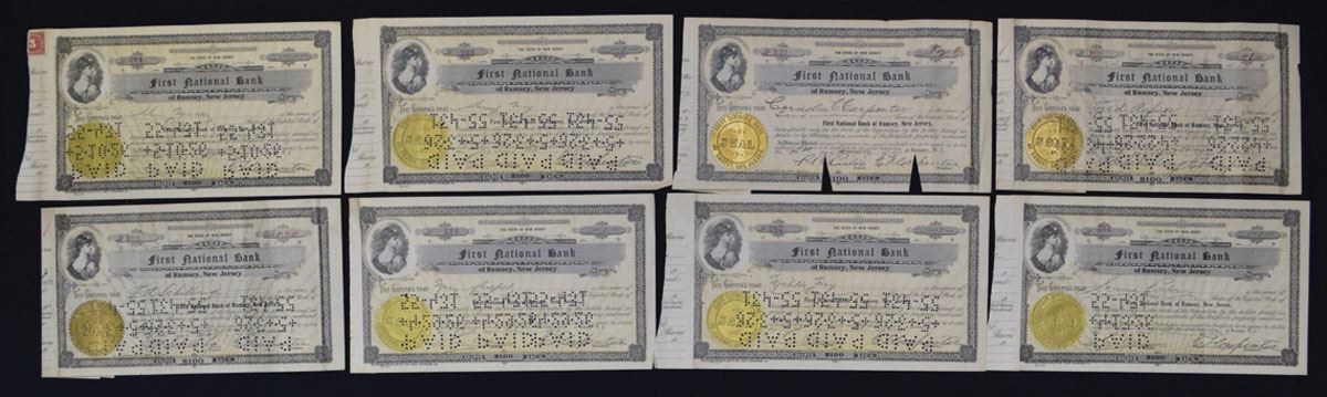 Ramsey, New Jersey, 1910-22. Lot of 8, I/C 1 Share Stock Certificates, Black with black print and gold underprint and vignette of Liberty at top left, All are pin punched Cancelled and have revenue stamp at left, All with portion of the counterfoil on the left which could be removed, VF to XF condition. (8). Sold "AS IS" no returns accepted.