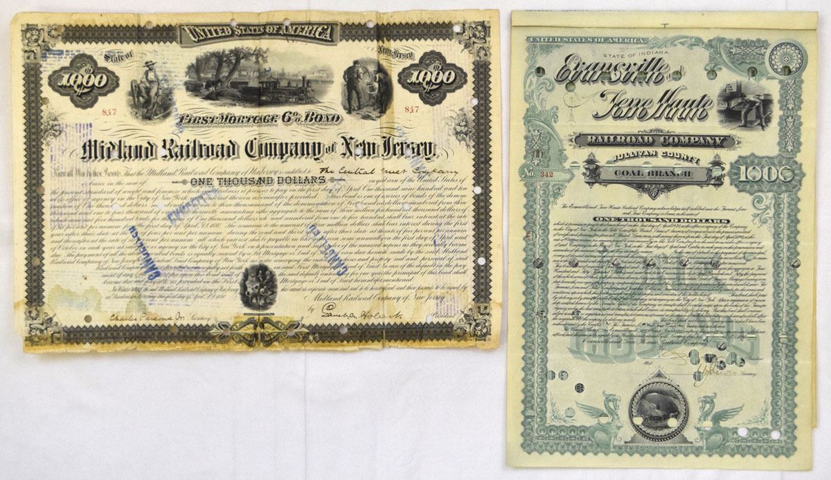 New Jersey & Indiana, 1880 and 1890. Lot of 2 I/C Bonds, Includes: 1880, Midland Railroad Co. of New Jersey, $1000 6% First Mortgage Bond and 1890, Evansville and Terre Haute Railroad Co. Sullivan County, Coal Branch, $10000 5% Coupon Bond. Both have POCs all over certificate, Fine condition with aggressive punch cancellations. (2). Sold "AS IS" no returns accepted.