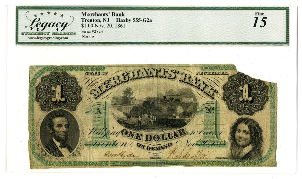 Trenton, New Jersey, November 20, 1861. $1, Haxby 555-G2a, Issued Obsolete Banknote, Black with green border and underprint, Abraham Lincoln at left with woman at right with river scene at center, Uniface note, S/N 2824 pp A, Legacy graded Fine 15 with comment "Missing UR Corner."
