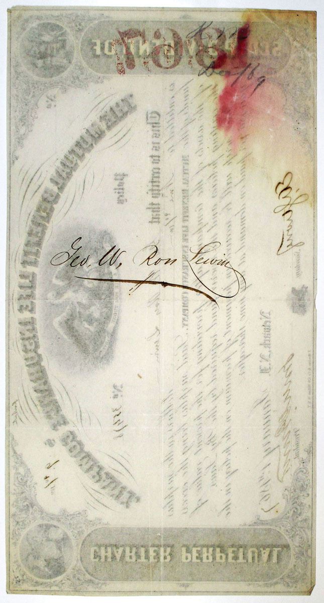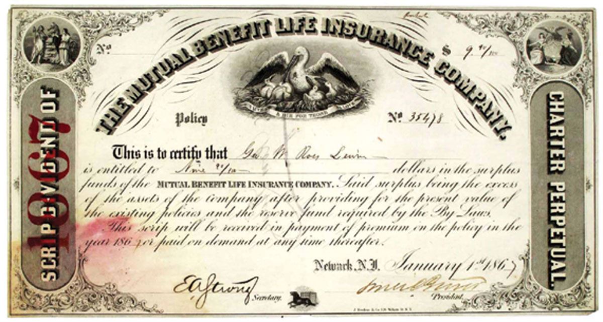 Newark, New Jersey. Mutual Benefit Life Insurance Co., 1867 $9.90 I/C Scrip Dividend, Fine-VF. The Mutual Benefit Life Insurance Company was a life insurance company that was chartered in 1845 and based in Newark in Essex County, New Jersey, United States. The company was headed by Frederick Frelinghuysen (1848–1924). The company was known as the "Tiffany" of insurance companies, a reference to its reputation as the life insurance company to the upper classes. Mutual Benefit Life was taken into receivership for rehabilitation by the New Jersey Department of Banking and Insurance on July 16, 1991, after losses in an overheated real estate market led to a run by policyholders, who ultimately lost the purported "cash value" that had been said to have accrued in their policies. At the time, the collapse was the largest ever of an American insurer. AMEV acquired the group life, accident and health insurance Mutual Benefit in 1991. SunAmerica acquired the remaining divisions in 1998. Effective June 14, 2001, Mutual Benefit was liquidated and dissolved.