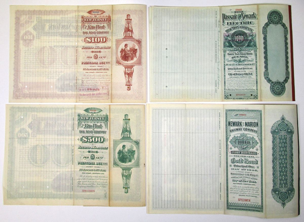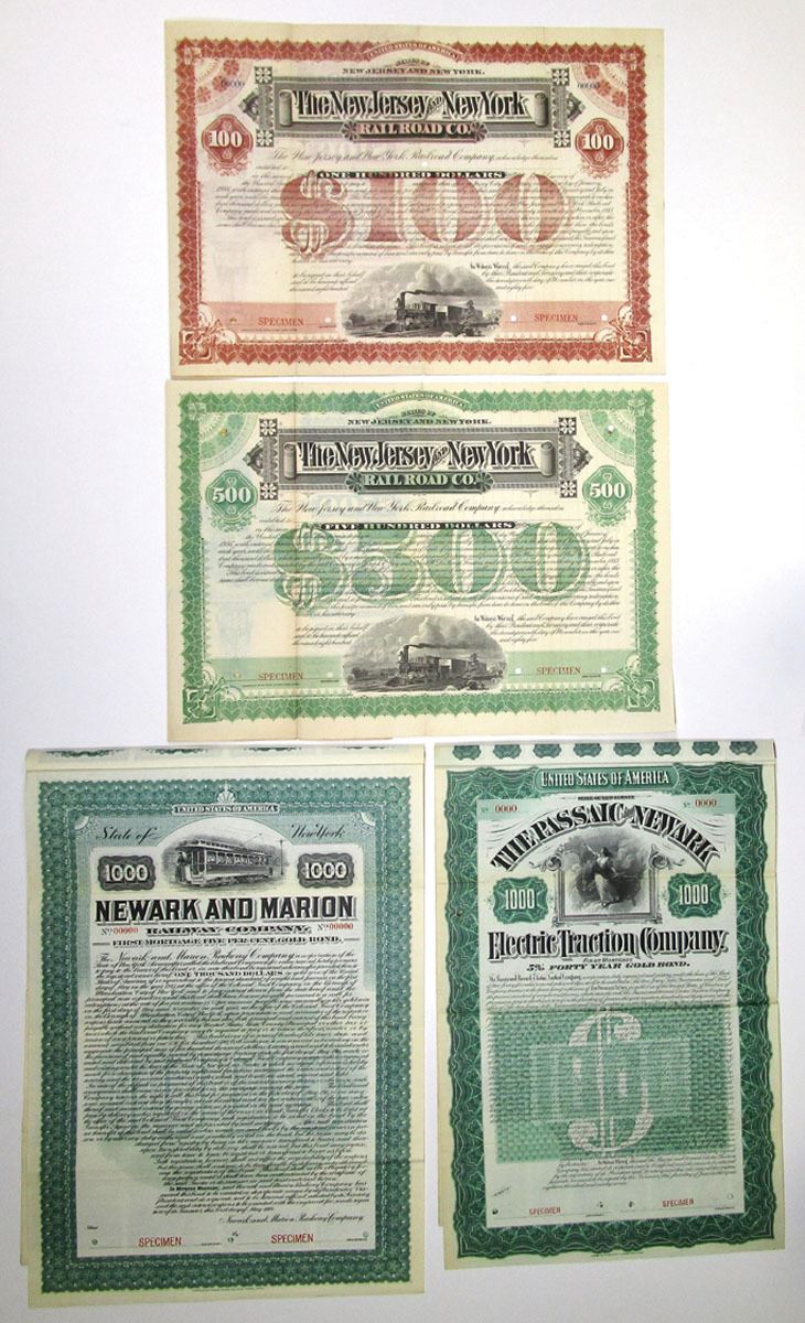 New Jersey & New York, 1885-1905. Lot of 4 Specimen Bonds, including New Jersey and New York Railroad Co: $100 5% Registered Second Mortgage Bond in brown; and $500 5% Registered Second Mortgage Bond in green; Passaic and Newark Electric Traction Co. $1000 5% First Mortgage Gold Coupon Bond in green, Rare in Cox; and Newark and Marion Railway Co. $1000 5% First Mortgage Gold Coupon Bond in green, Unlisted in Cox, Very Rare. All have specimen overprints and POCs. VF condition, ABNC. (4)