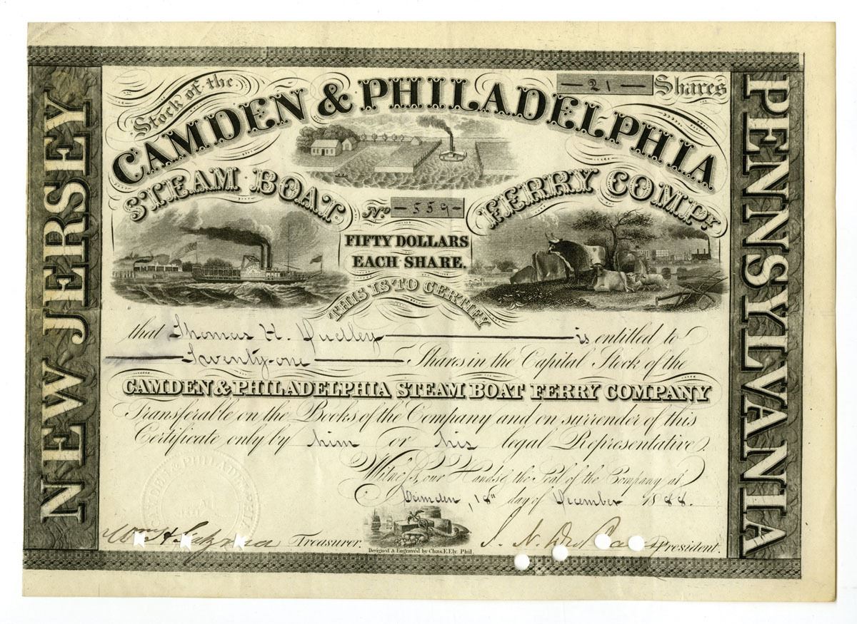 New Jersey & Pennsylvania, 1888. 21 Shares Capital Stock I/C Certificate, Black print with black border, Steam boats and cattle at top center under company title, S/N 559, POCs along bottom through signatures. VF to XF condition.