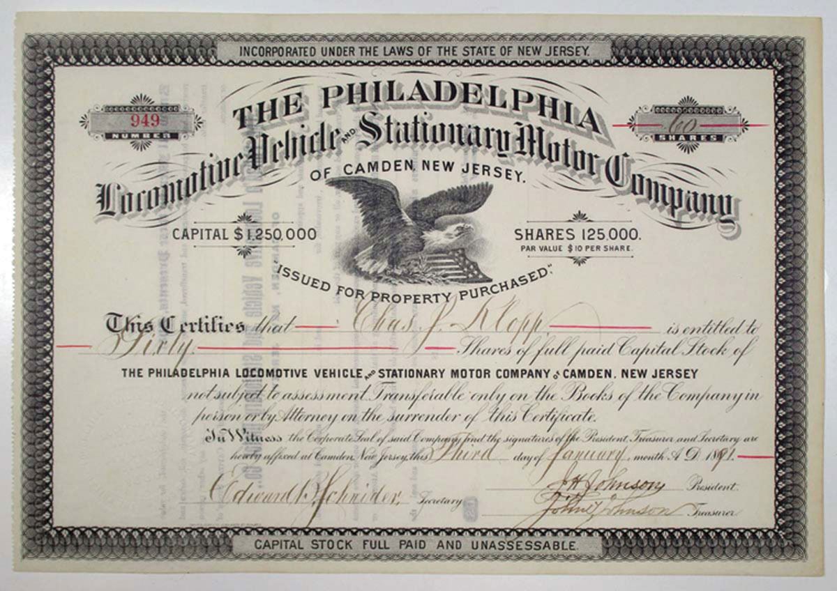 NJ. Philadelphia Locomotive Vehicle & Stationary Motor Co., 1891 I/U Stock Cert