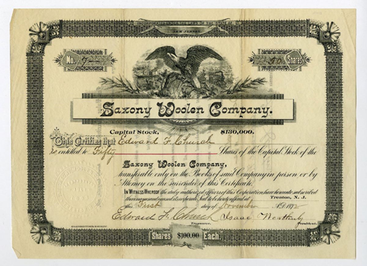 Trenton, New Jersey. Saxony Woolen Co., 1892 50 Shrs Capital Stock I/U Certificate, #7, XF
