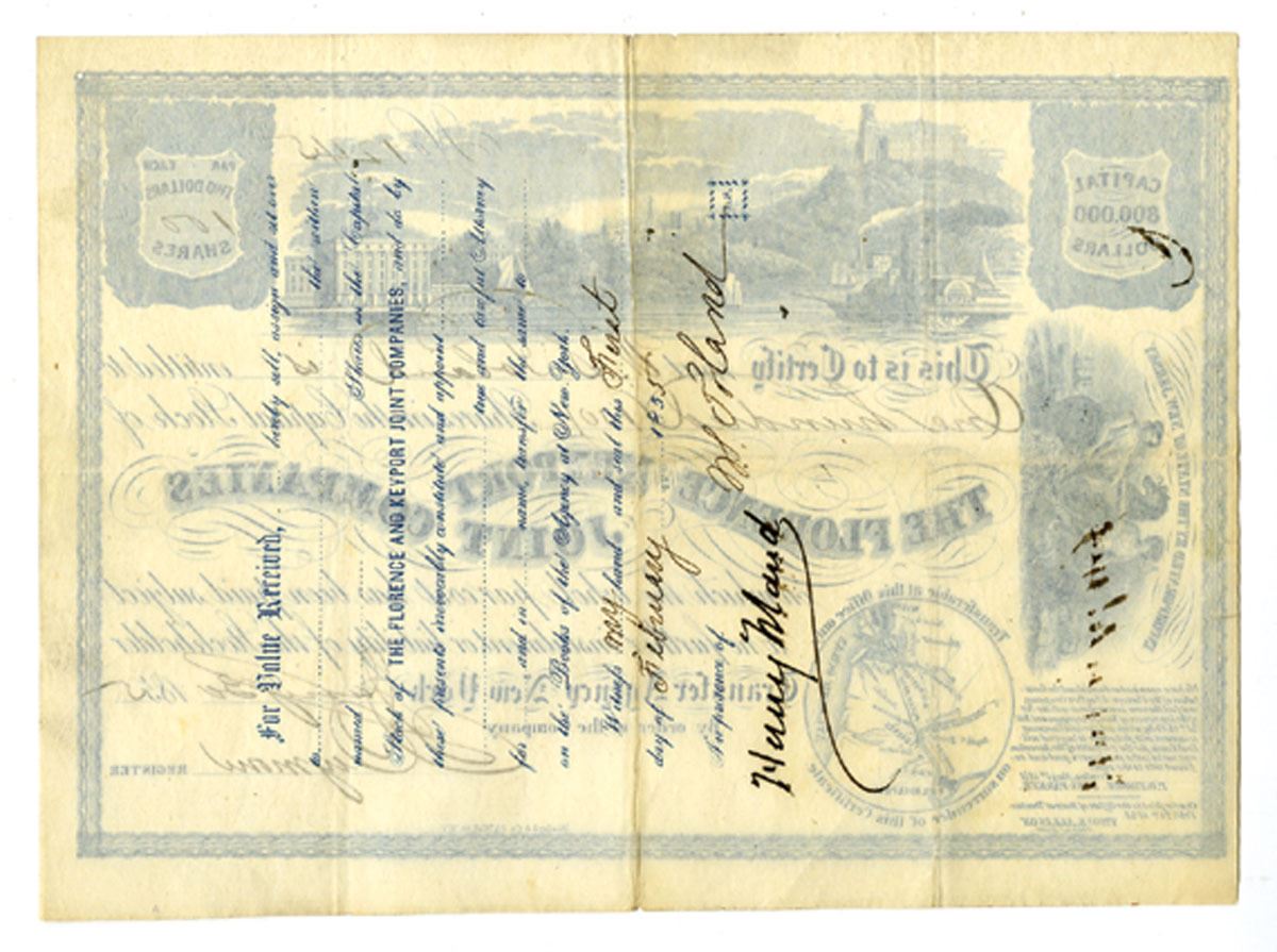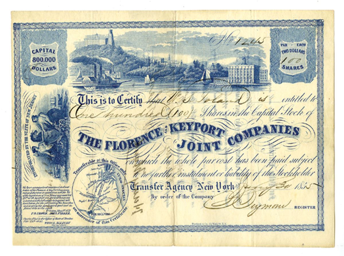 New Jersey...., 1855, The Florence & Keyport Joint Companies, 100 Shares I/U Capital Stock Certificate, issued to W.S. Toland for 100 shares at $2 each; blue border and ornate title with allegorical vignette of Agriculture at left, scenic river view at top showing a steamboat, sailing ships, and a large building, and an inset map at lower left illustrating the company’s proposed route connecting Florence on the Delaware River to Keyport on Raritan Bay; printed by Rawdon, Wright & Co., New York; the company was chartered in 1853 with $800,000 in capital to create a direct link between New York and Philadelphia, but soon collapsed during the speculative boom of the 1830s, leaving behind few surviving certificates; issued and dated 1855 with manuscript signatures; condition VF with folds and light toning.