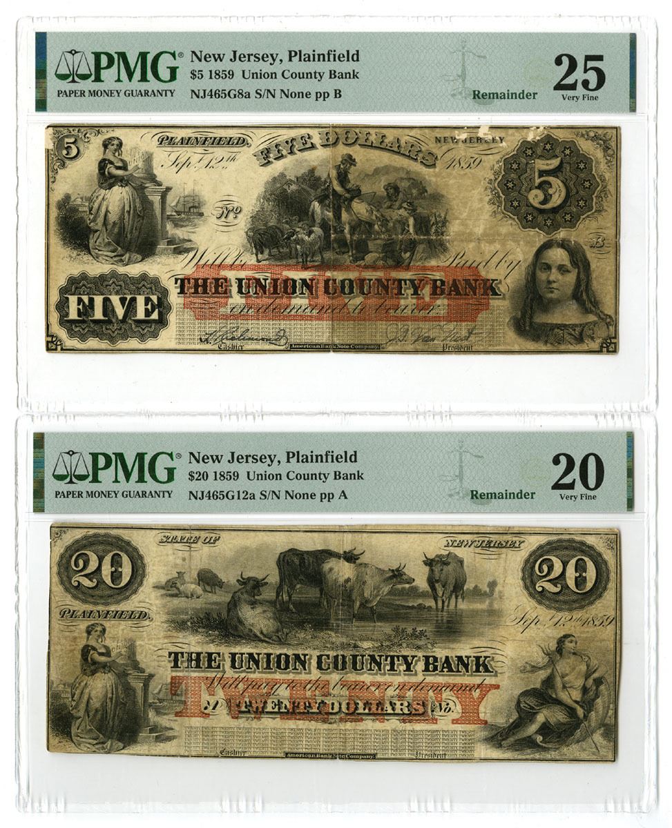 Plainfield, New Jersey, 1859. Lot of 2 Banknotes: $5, NJ465G8a, Remainder Banknote, S/N None pp B, PMG graded Very Fine 25 with comments "Signatures Falsely Added, Stained, Paper Pulls;" $20, NJ465G12a, Remainder Banknote, S/N None pp A, PMG graded Very Fine 20 with comments "Previously Mounted, Tears." Both are printed by ABNC. (2). Sold "AS IS" no returns accepted.