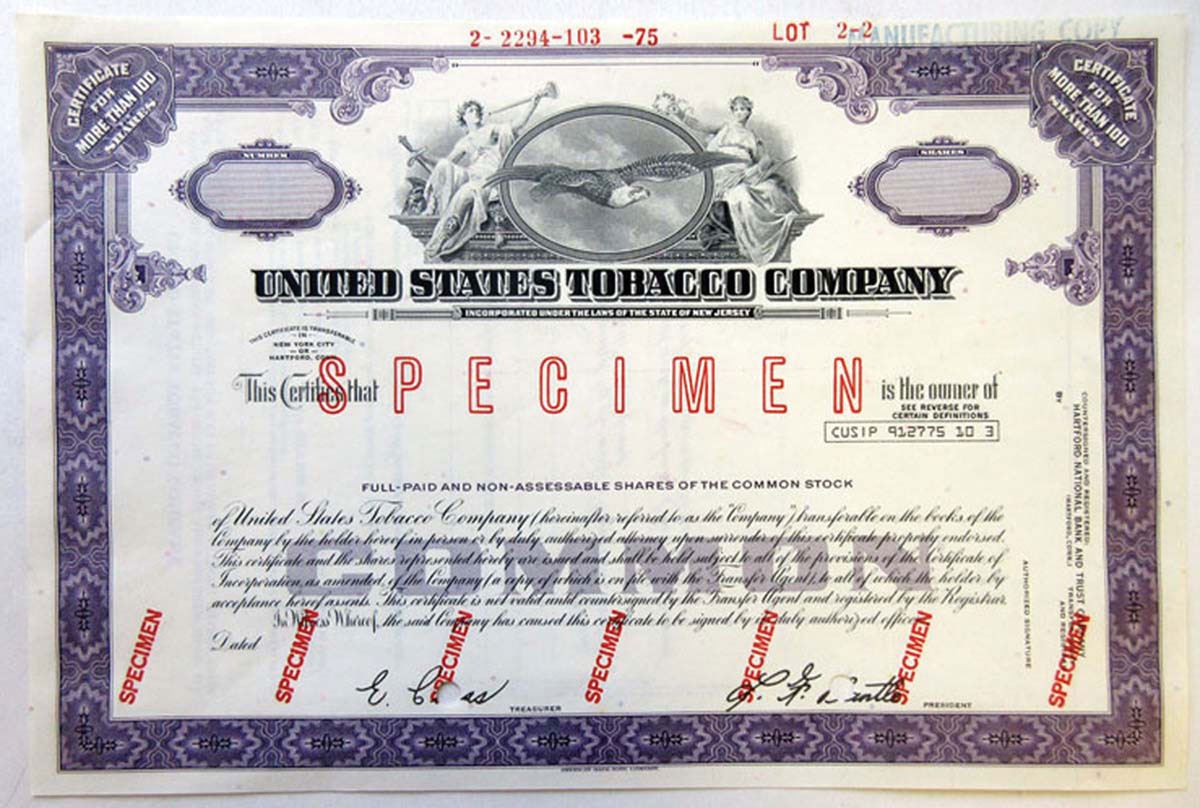 NJ. United States Tobacco Co, 1975 >100 Shrs Specimen Stock Cert., VF ABN Purple. United States Tobacco Co was a tobacco company later becoming known as UST Inc.