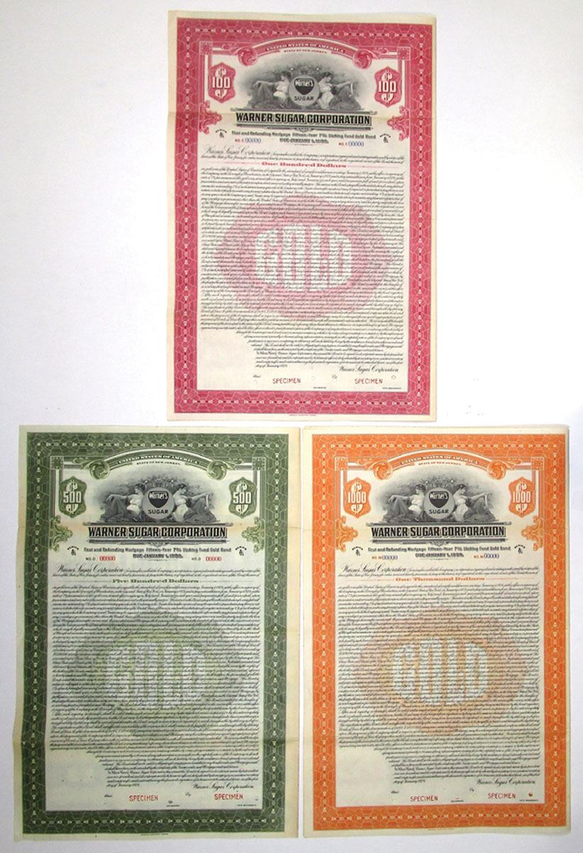 New Jersey, 1924. Lot of 3 Specimen Bonds, all are 7% First and Refunding Mortgage Sinking Fund Gold Coupon Bonds, including: $100 with red border; $500 with green border; and $1000 with orange border, all featuring the same vignette of the Warner Sugar Corp. logo flanked by allegorical women at top center. All have Specimen overprints and POCs, and range from VF to XF condition. ABNC. (3). Sold "AS IS" no returns accepted.