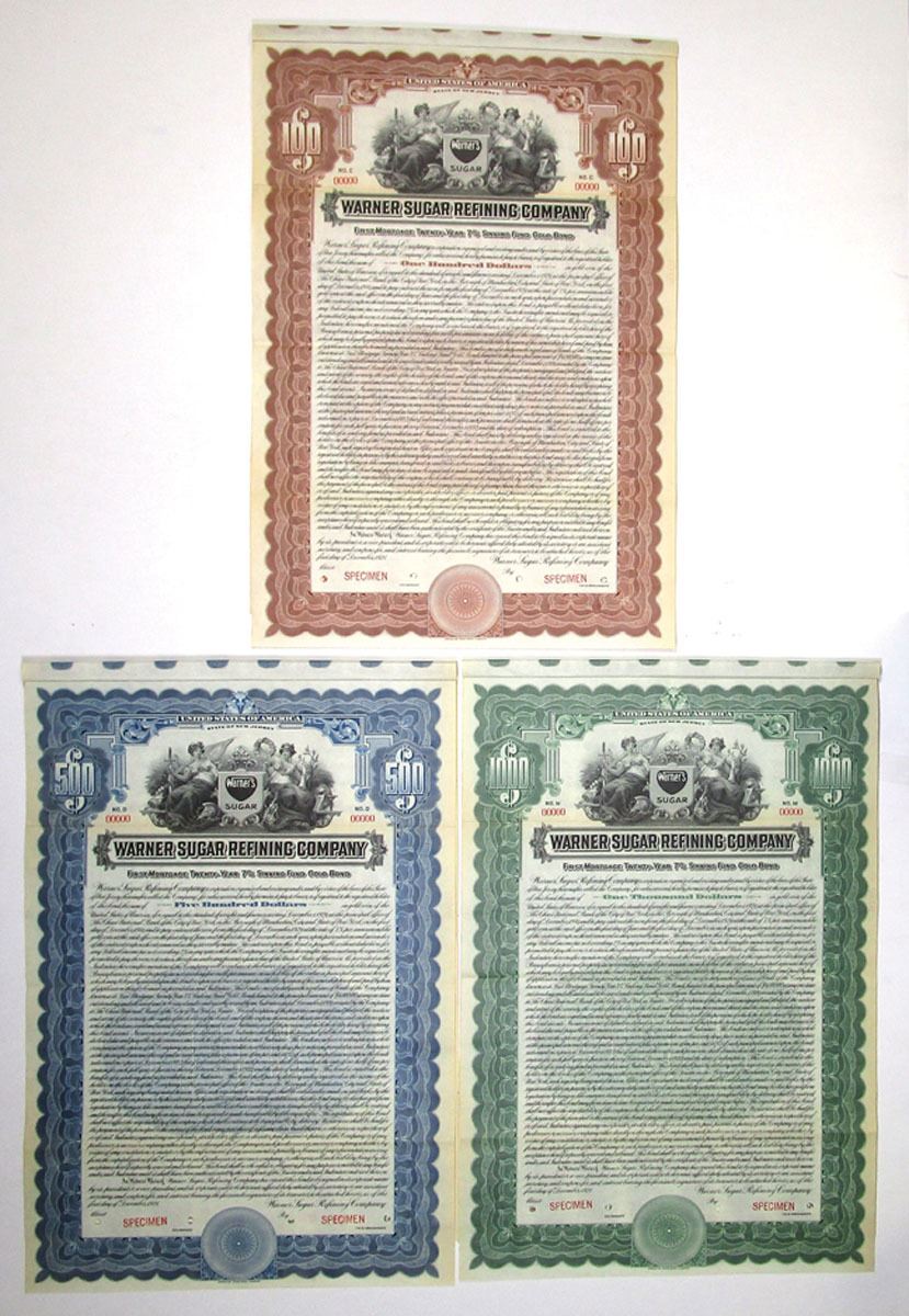 New Jersey, 1921. Lot of 3 Specimen 7% First Mortgage Sinking Fund Gold Coupon Bonds, including: $100 with brown border; $500 with blue border; and $1000 with green border. All have the same vignette of company logo flanked by allegorical women at top center. All have Specimen overprints and POCs, and range from Fine to VF condition. ABNC. (3). Sold "AS IS" no returns accepted.