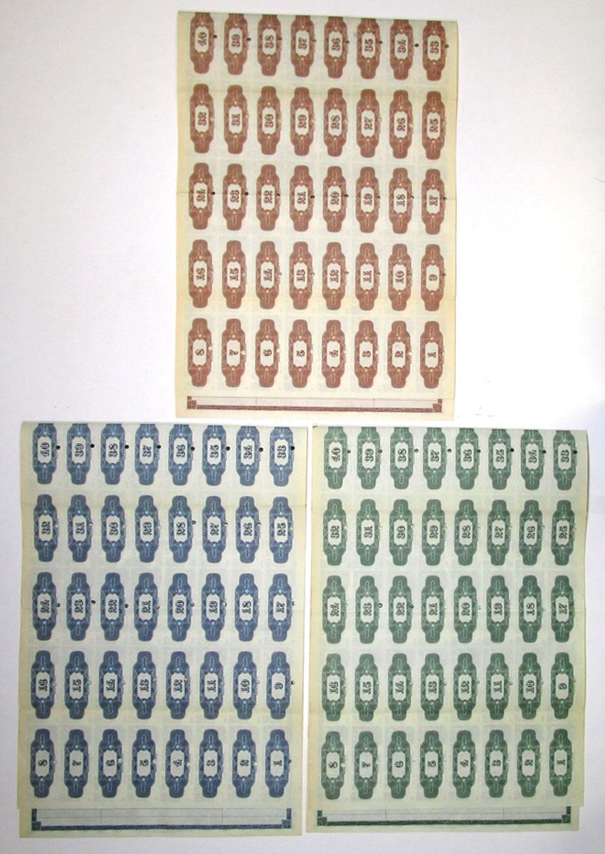 New Jersey, 1921. Lot of 3 Specimen 7% First Mortgage Sinking Fund Gold Coupon Bonds, including: $100 with brown border; $500 with blue border; and $1000 with green border. All have the same vignette of company logo flanked by allegorical women at top center. All have Specimen overprints and POCs, and range from Fine to VF condition. ABNC. (3). Sold "AS IS" no returns accepted.