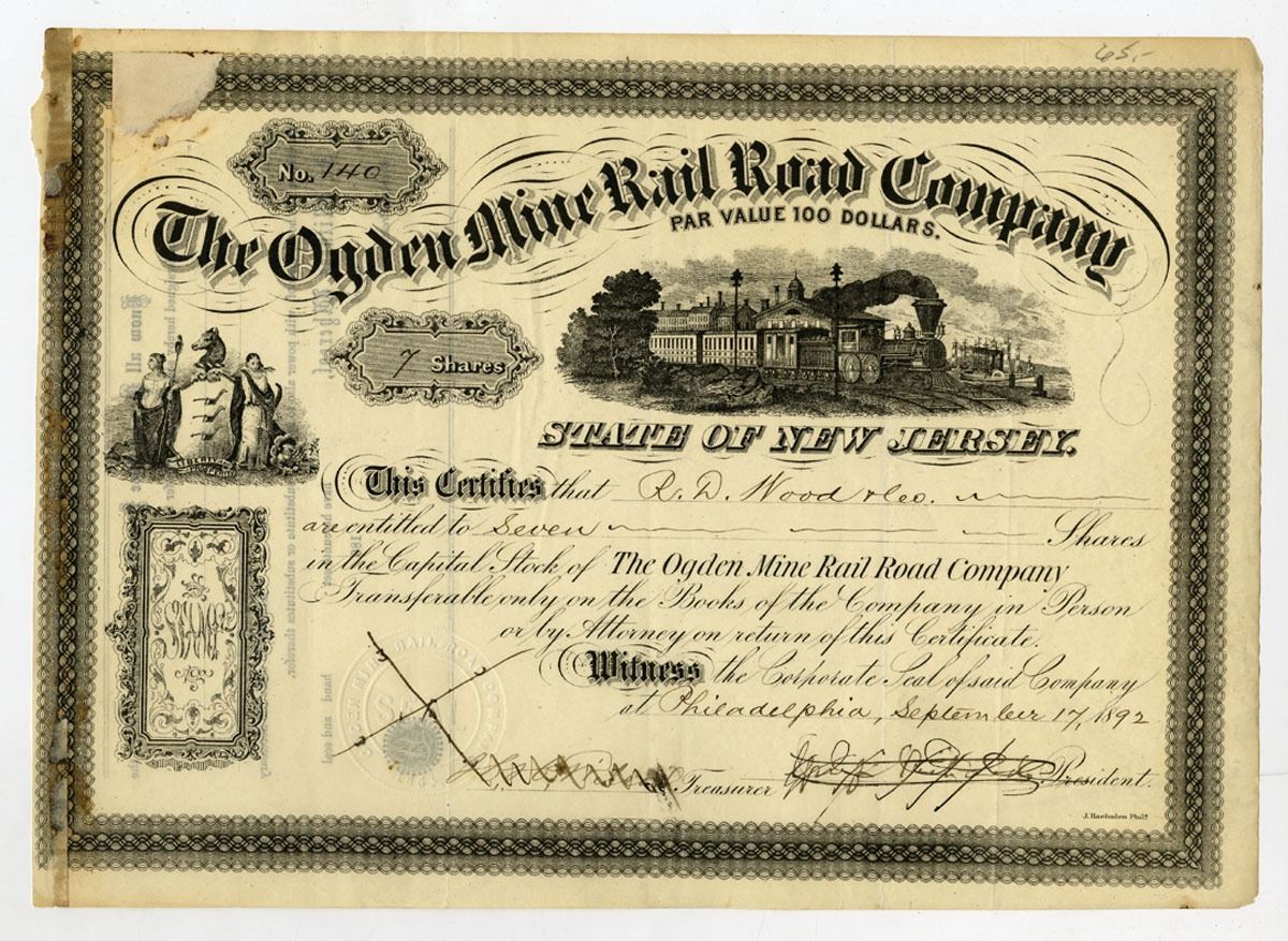 New Jersey. (Inc. in Philadelphia), 1892. I/C, 7 Shares Capital Stock Certificate, Black printing, Locomotive at top and seal of Pennsylvania at left, S/N 140, Crossed out cancelled, Fine condition with excess paper attached to face and glue stains on top left corner.