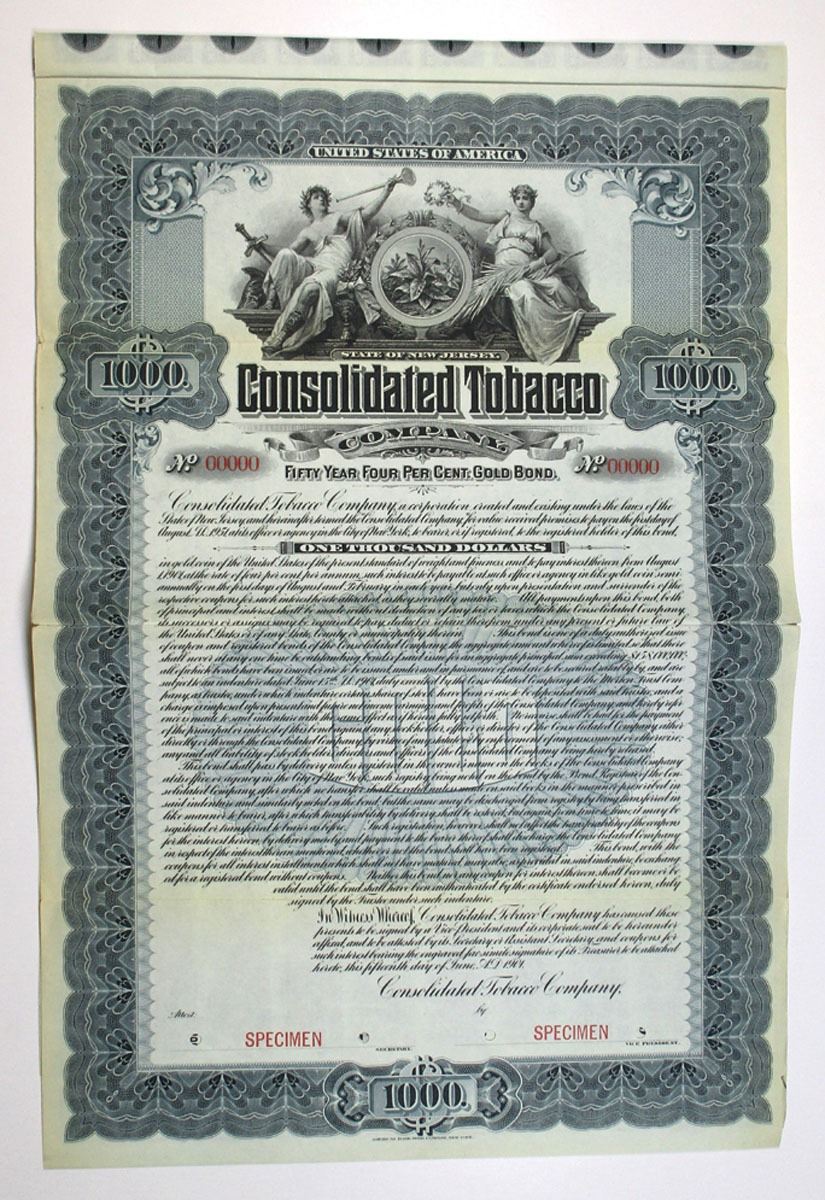 New Jersey, 1901. $1000 Specimen 4% Fifty Year Gold Coupon Bond, Black with steel gray border and underprint, Allegorical figures flank tobacco plant at top center, Specimen overprints and POCs, Fine-VF condition, ABNC. The Consolidated Tobacco Company was formed in 1901 to take over the common stock of the American and Continental Tobacco Companies.